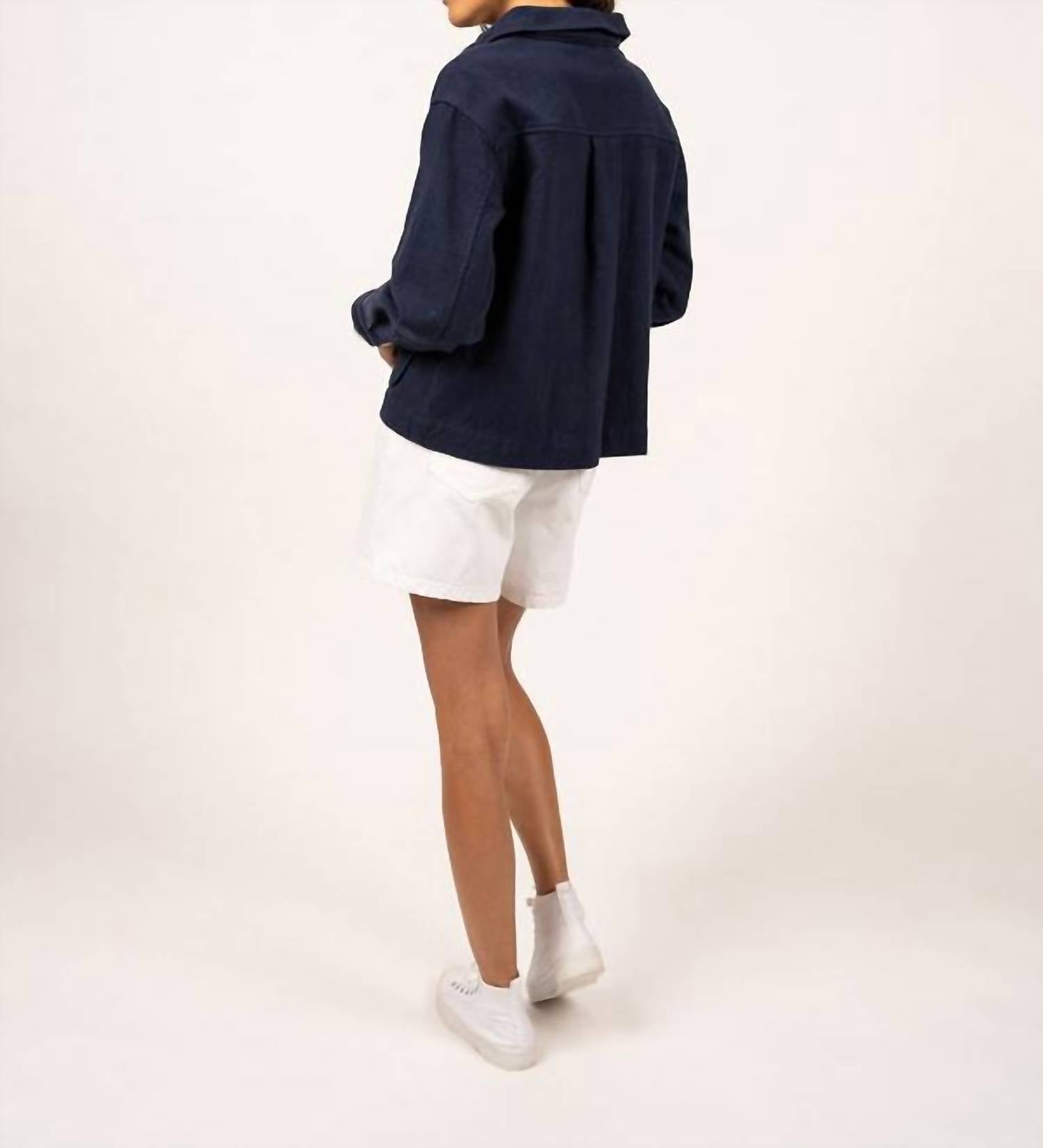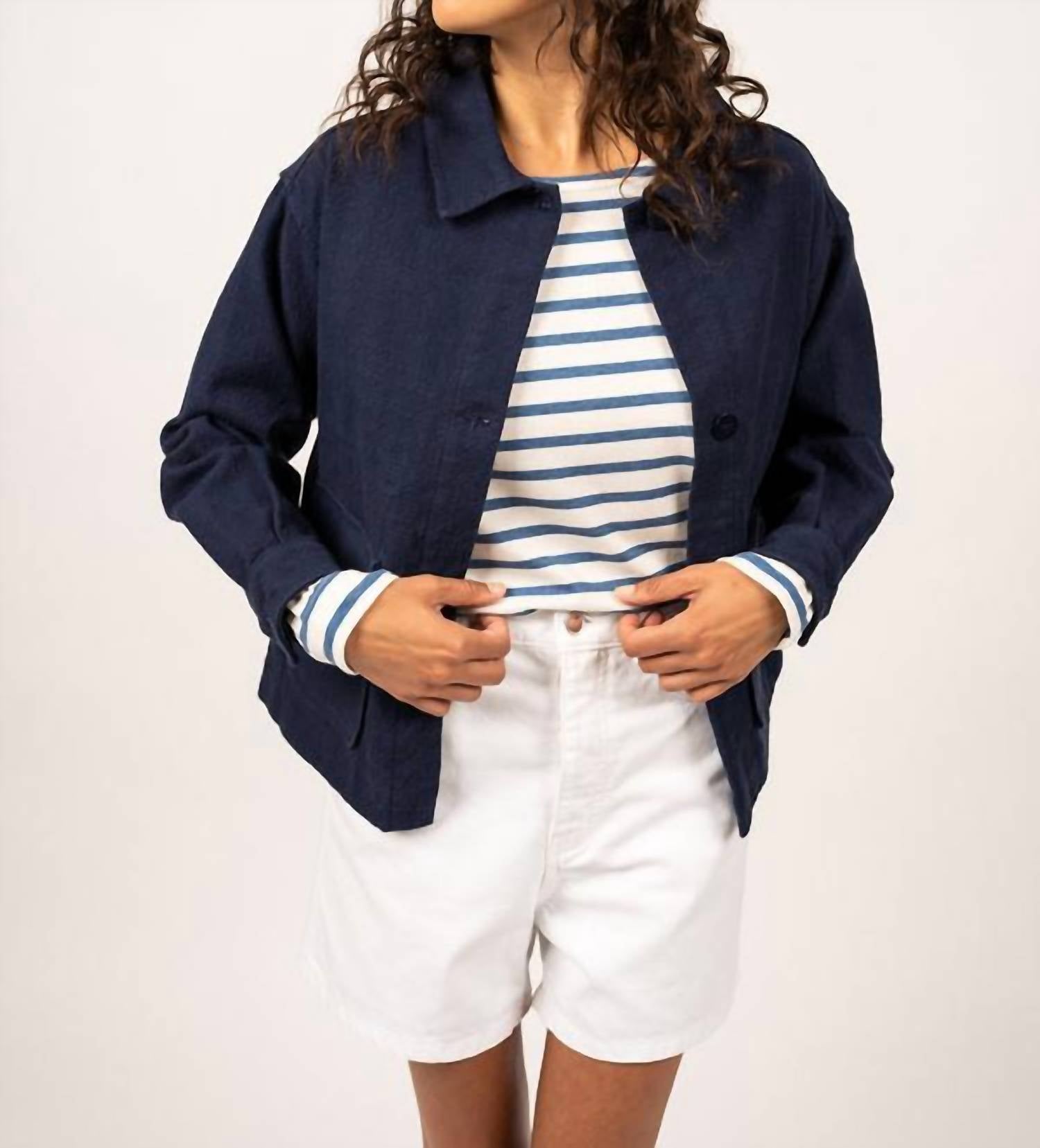 The coolest, most versatile utility jacket. Match it with your favorite pair of denim or throw it over any day dress. Introducing the Sophie Jacket by SAINT JAMES, a perfect blend of workwear functionality and elegant design. This long sleeve utility jacket is crafted from thick, rustic-looking cotton canvas in a solid marine color, ensuring durability and style. It features a classic collar and is designed with two practical patch front pockets, complemented by cinched cuffs for a sophisticated silhouette. Closure: Button closure.