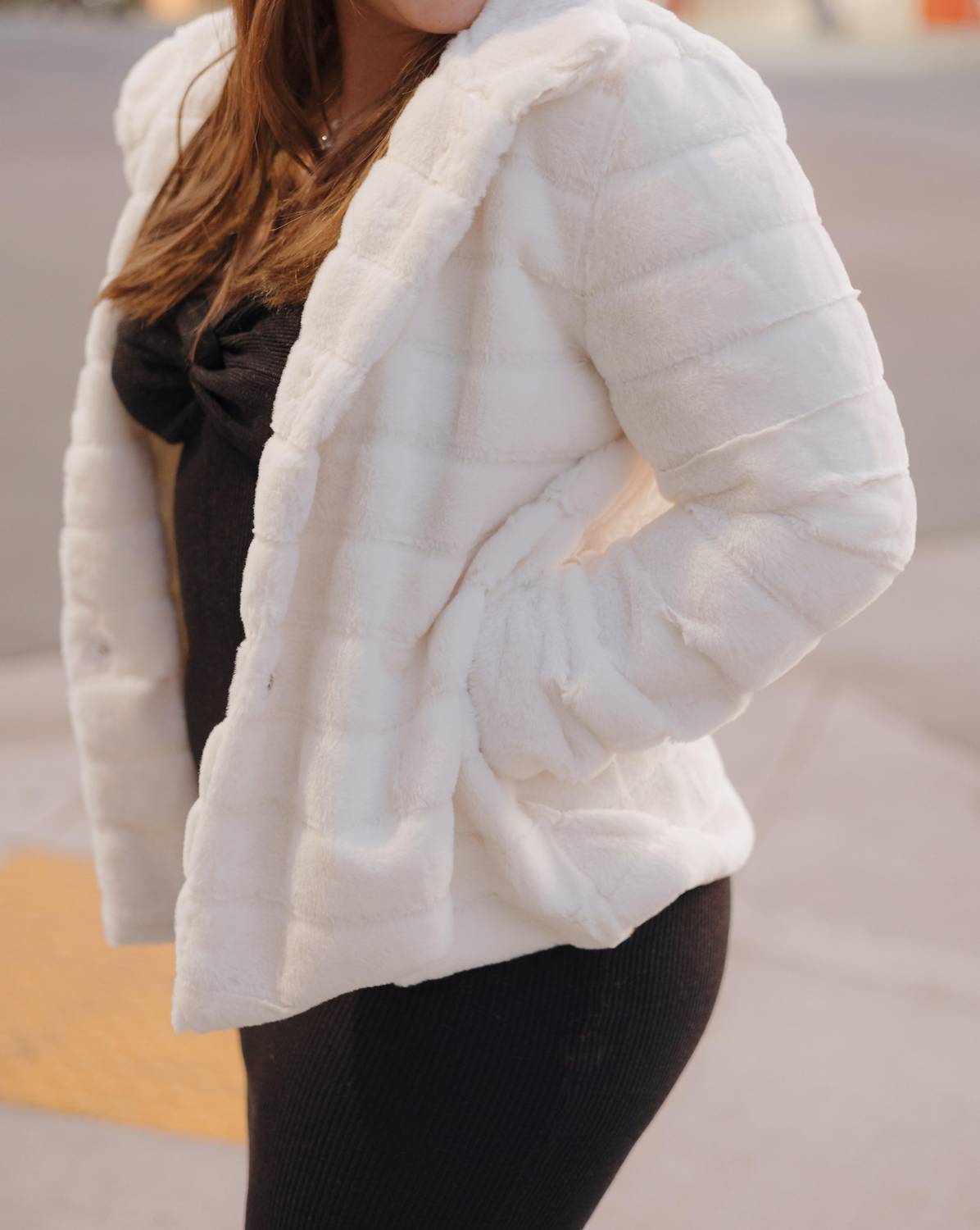 This utility jacket is the perfect combination of cool and feminine. Meet the Lola Fluffy Coat by EN CREME, a minimalist statement piece perfect for a Thanksgiving dinner party. This women's utility jacket in solid white features long sleeves and a convenient snap closure. Equipped with hidden pockets, it's as functional as it is stylish. Embrace effortless elegance with this coat, ideal for the fall season.