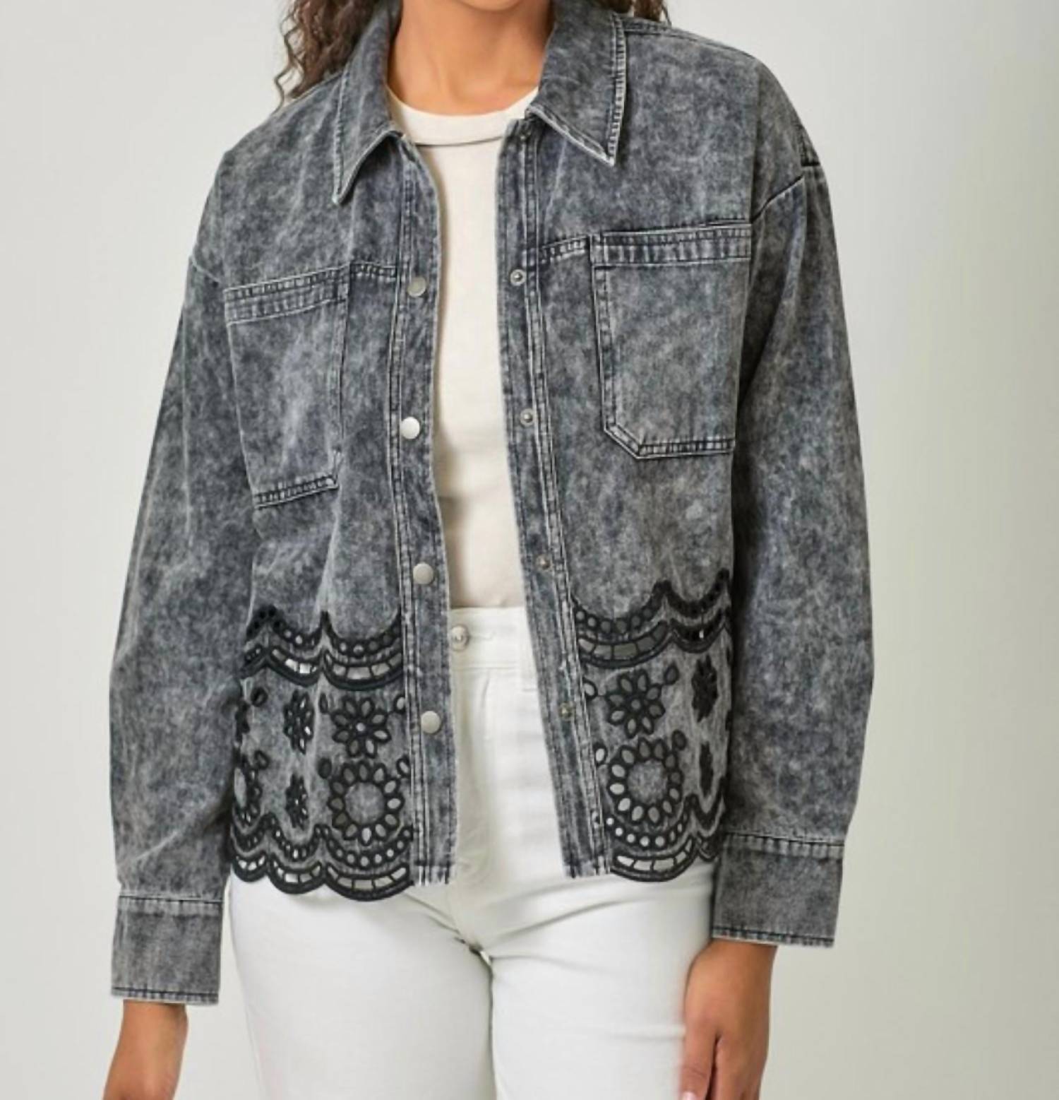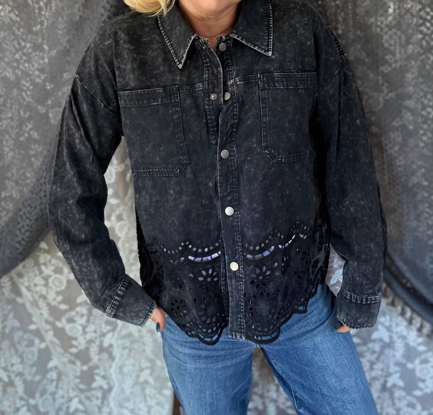 The coolest, most versatile utility jacket. Match it with your favorite pair of denim or throw it over any day dress. Meet the Purposeful Perfection Jacket by Mystree, a chic utility jacket that seamlessly blends timeless style with a modern twist. This long sleeve, solid washed black jacket is crafted from 100% cotton, offering a comfortable and durable addition to your wardrobe. Featuring a button-up closure and intricate lace trim at the hem, this piece is elevated with versatile chest pockets for added functionality. Care instructions include machine washing on a cold, gentle cycle and hanging to dry.