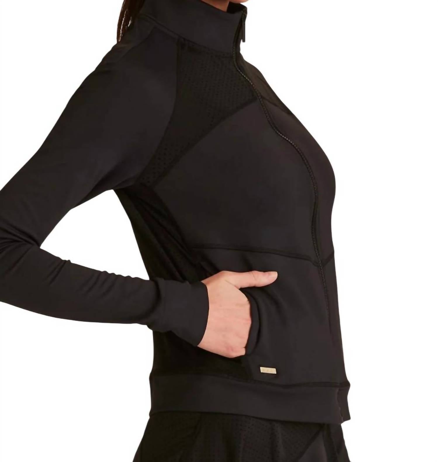 Full-zip jacket with pindot mesh for ventilation, front pockets, and flatlock seaming. The blue fabric offers SPF50+ protection. 77% Recycled Polyester, 23% Spandex; details: 75% Nylon, 25% Spandex. Machine wash cold with like colors on a gentle cycle. Do not bleach. Tumble dry low or lay flat away from direct sunlight. Use a cool iron for wrinkles. Avoid steaming and dry cleaning.