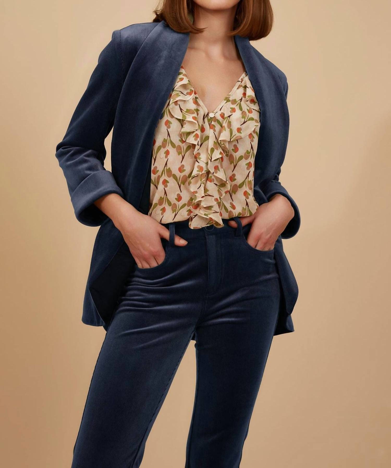 The coolest, most versatile utility jacket. Match it with your favorite pair of denim or throw it over any day dress. Introducing the Corrie Bratter Boyfriend Blazer by Traffic People, a best-selling winter staple designed for chic comfort. Crafted from 95% polyester and 5% elastane, this luxurious corduroy jacket in navy boasts long sleeves and a boyfriend length with a full-length curved collar for a relaxed fit. Practical yet stylish, it features pockets ideal for utility and can be machine washed at 30°C for easy care. Pair it with matching trousers for a complete look.