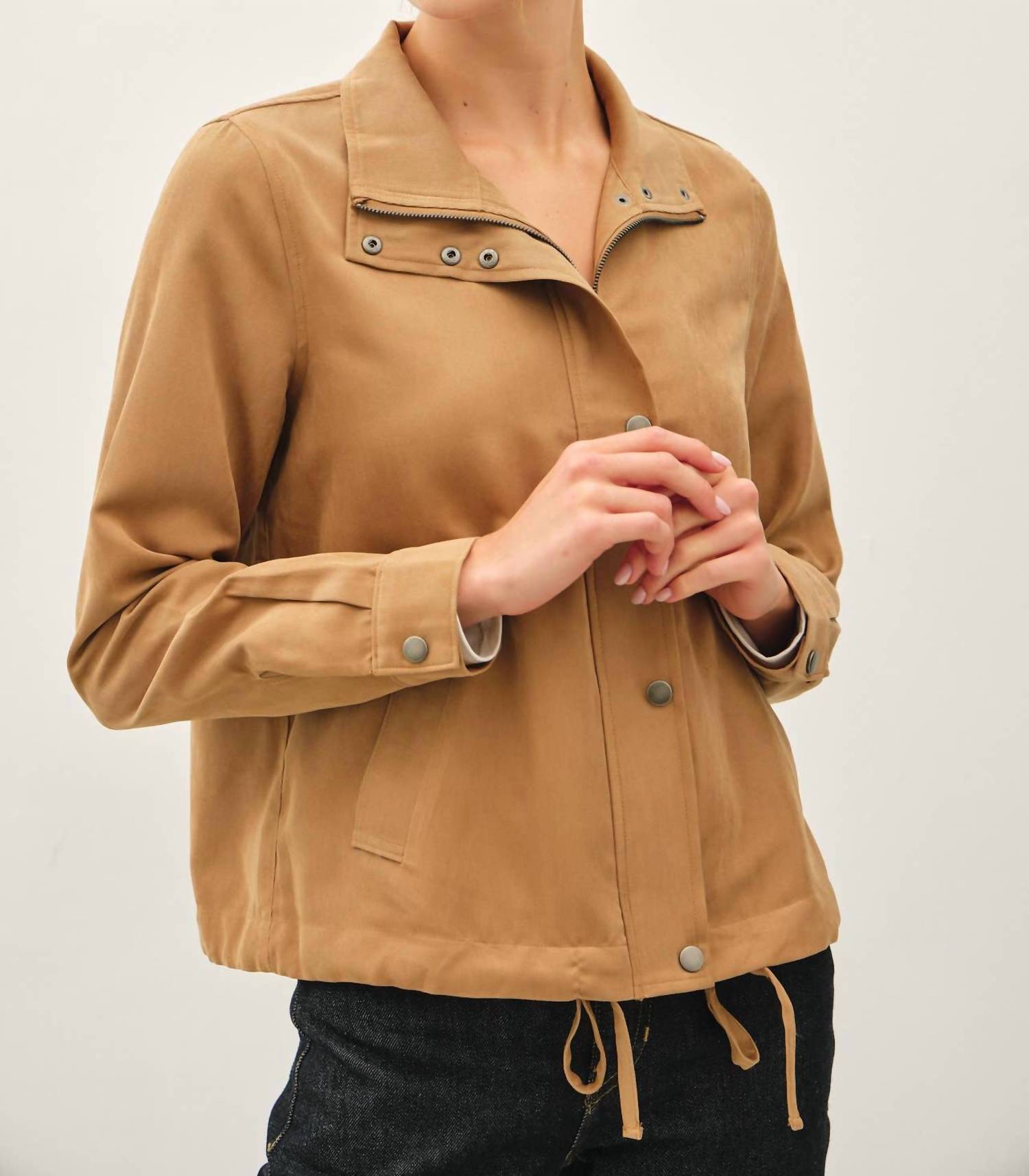 The ultimate cool-girl utility jacket. Introducing the Tonia Soft Utility Jacket by Be Cool, a perfect addition to your fall wardrobe in a rich camel hue. This long-sleeve jacket offers a blend of style and functionality, crafted from a luxurious suede-like fabric for maximum comfort. Featuring a zip-up front closure and adjustable drawstring at the hem, it provides a customizable fit that suits any occasion. Care instructions: Dry clean only.