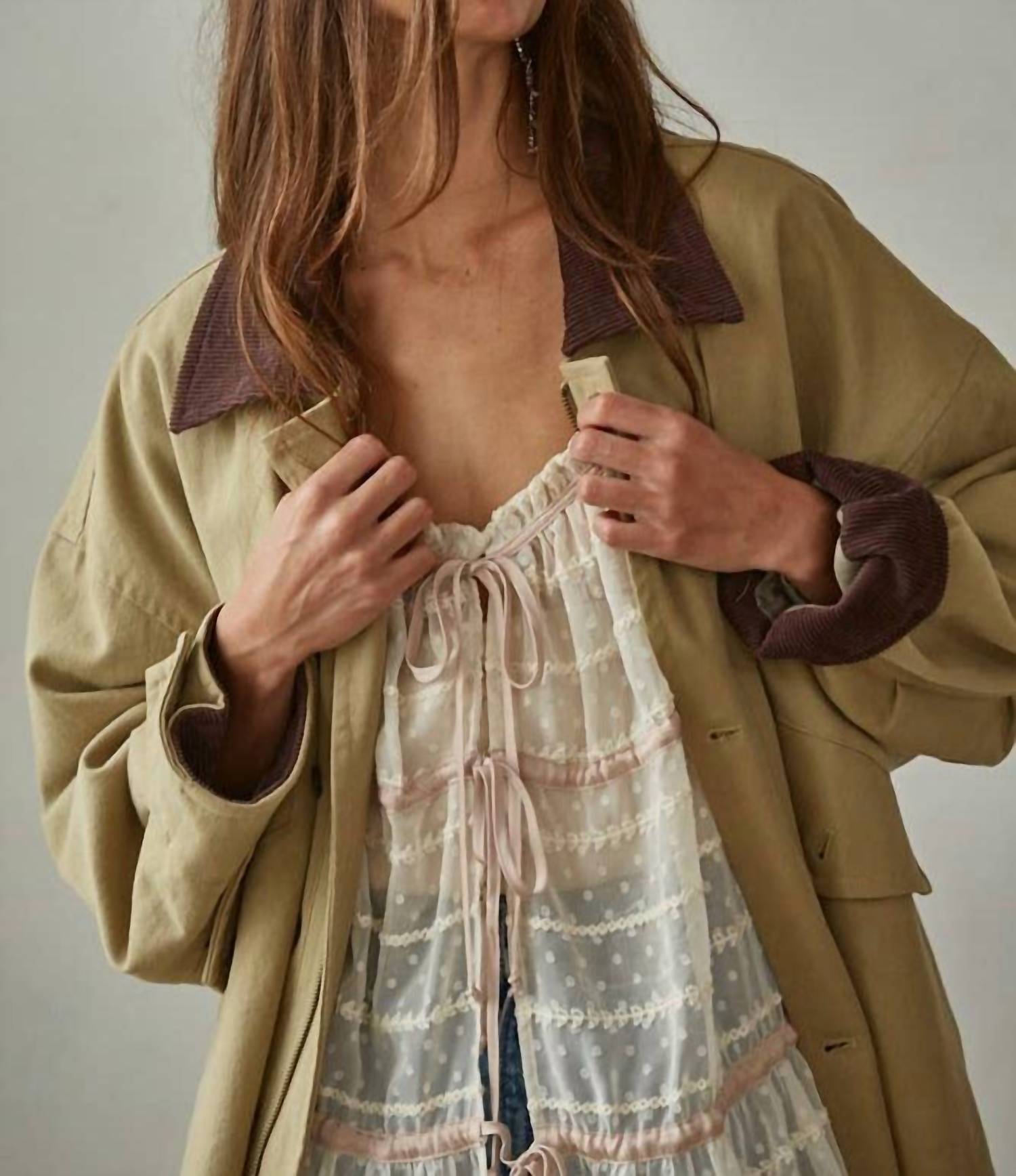 This utility jacket is the perfect combination of cool and feminine. Introducing the Woven Cotton Contrast Corduroy Utility Jacket by By Together, perfect for women's fall travel and minimalist style in a solid khaki color. This long sleeve jacket is crafted from 100% cotton with a contrast corduroy collar and features a relaxed fit. Designed with front pockets, a button closure, and an inside zipper, it offers versatility and utility. Ideal for layering, it pairs effortlessly with tees or lightweight knits for an elevated casual look, suitable for Thanksgiving occasions.