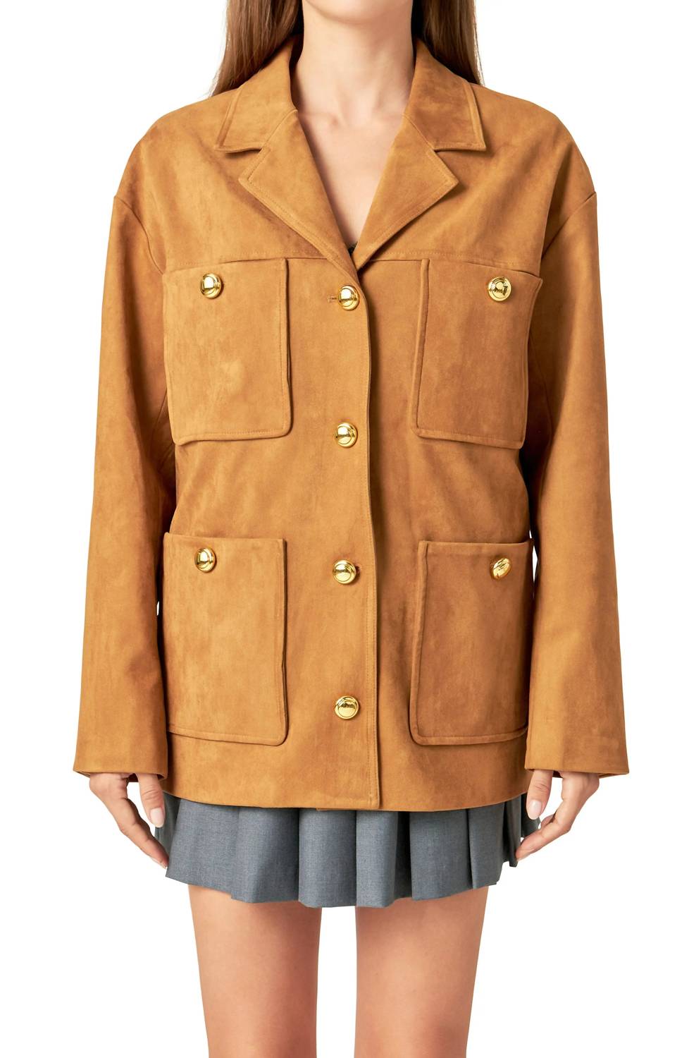 Elevate your outerwear game with the Padded Shoulder Suede Jacket by English Factory in a striking Copper hue. This utility jacket boasts long sleeves and a supple faux-suede finish enhanced by glossy goldtone buttons. Crafted from 90% polyester and 10% spandex, it features a button closure and offers both chest and front button-patch pockets. Care instructions include hand washing and laying flat to dry, while classic details such as notched lapels and four-button cuffs complete this imported piece.