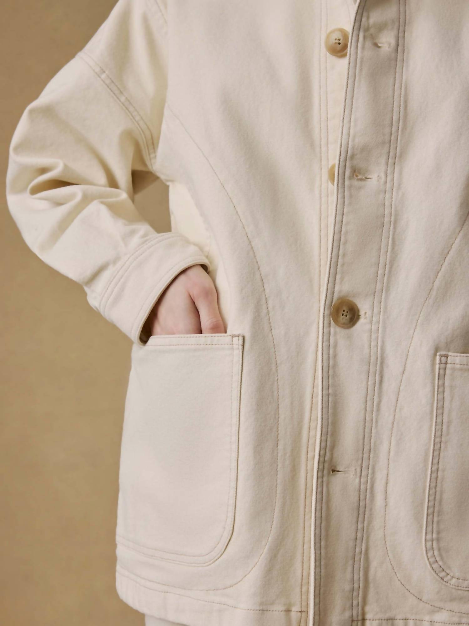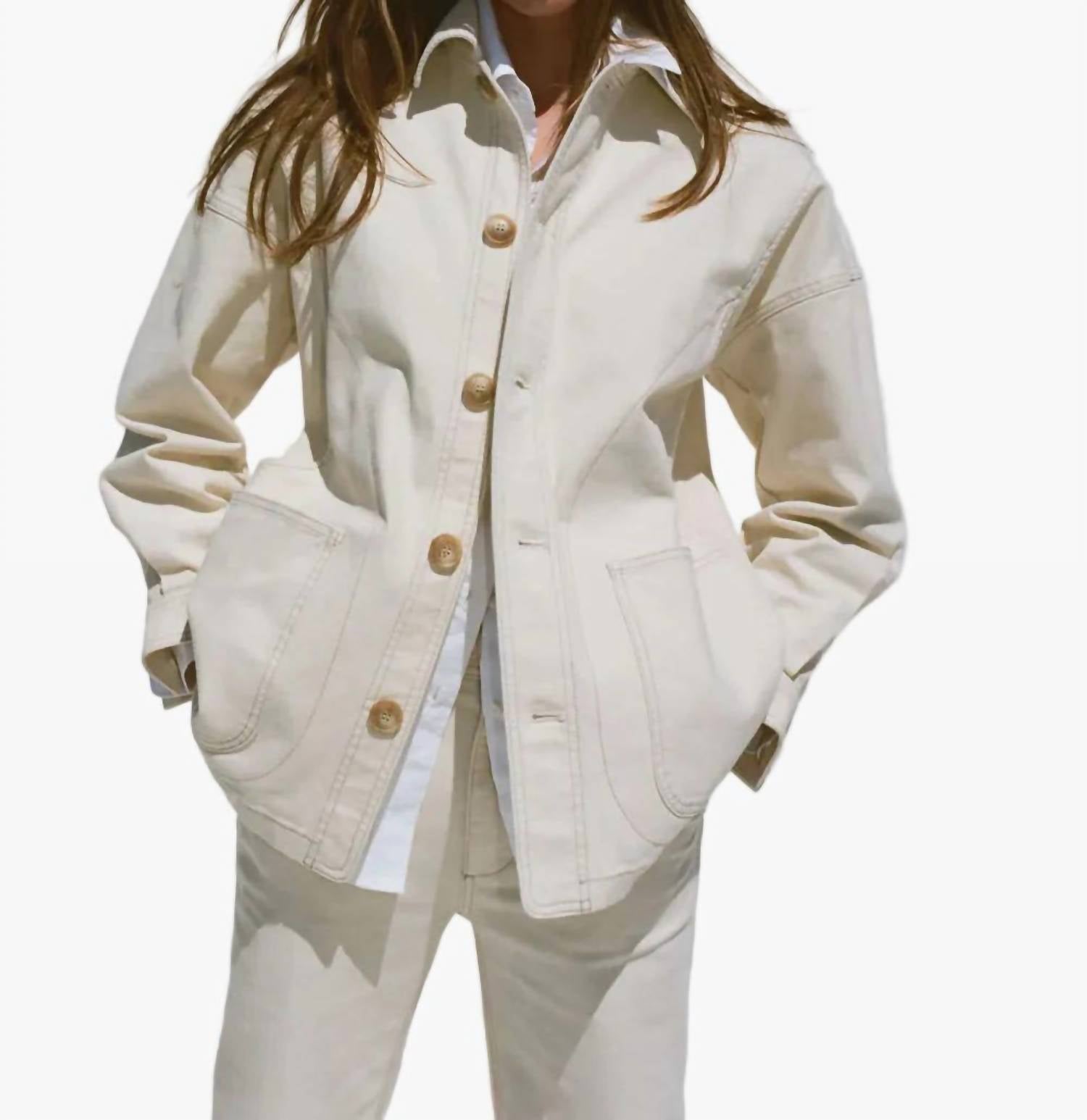 The coolest, most versatile utility jacket. Match it with your favorite pair of denim or throw it over any day dress. Meet the Sunwashed Canvas Chore Jacket by Faherty, your new layer for effortless style in a sea salt hue. Designed with long sleeves and a classic collar, this solid utility jacket features a button closure and roomy pockets for all your essentials. Its relaxed fit and sunwashed canvas material offer a perfectly worn-in vibe, ideal for travel or casual outings. Origin may vary, but the charm remains universal.