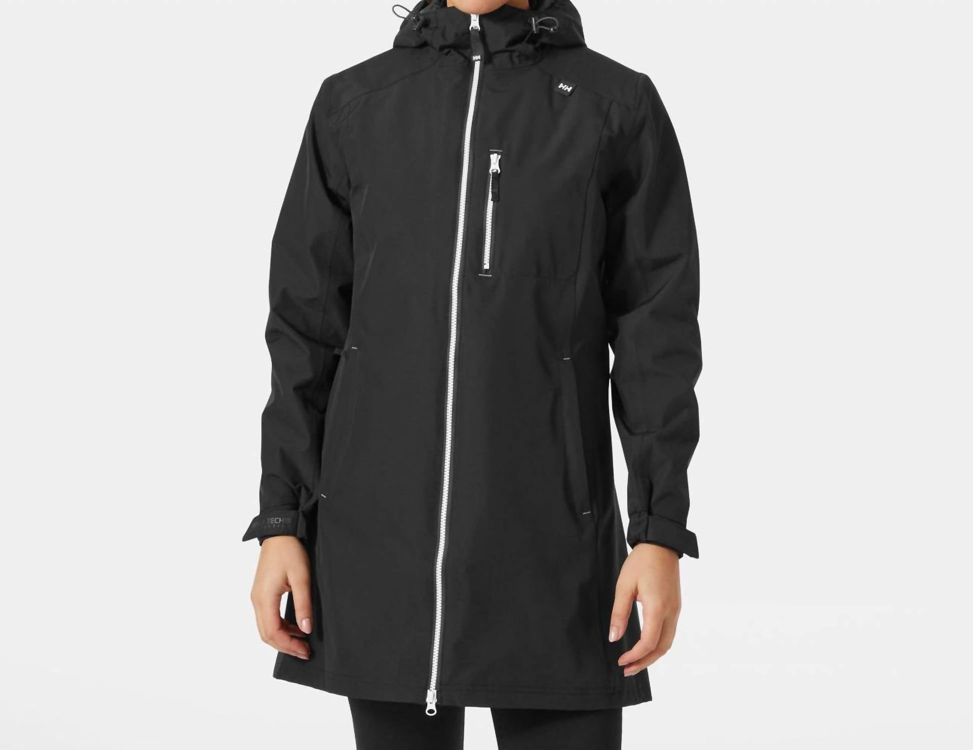 The coolest, most versatile utility jacket. Match it with your favorite pair of denim or throw it over any day dress. Discover the Long Belfast Jacket by Helly Hansen, an essential utility jacket in a solid black hue perfect for travel. This women's jacket features long sleeves and a practical hooded neckline. Made from durable polyester with a convenient zip closure and functional pockets, it's both stylish and functional. Care: Machine wash and tumble dry.