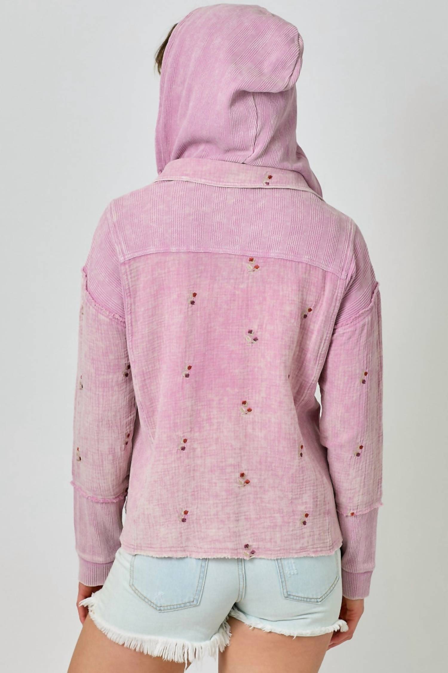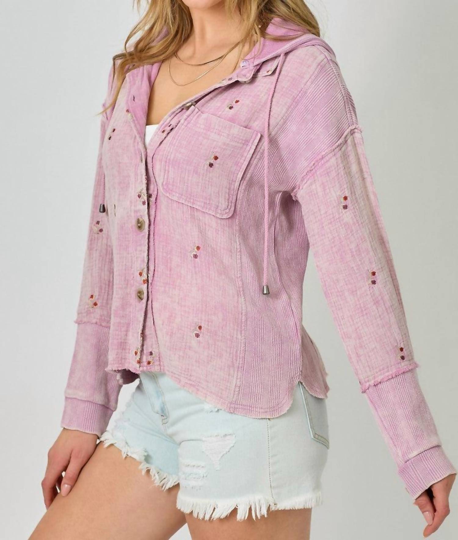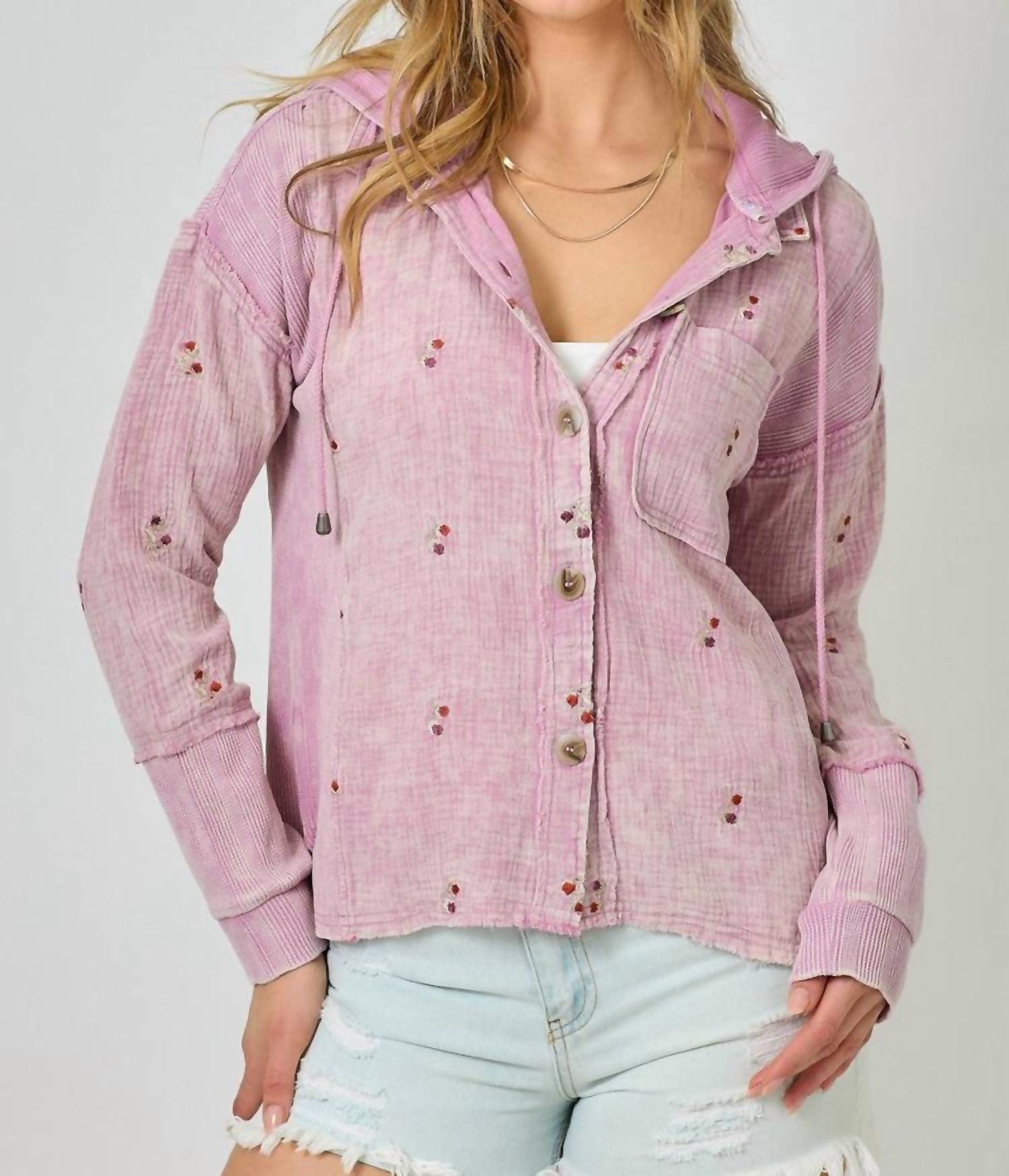 The ultimate cool-girl utility jacket. Elevate your travel wardrobe with the Morning Mist Jacket by Mystree in Washed Rose, a minimalist utility piece perfect for spring. This patterned jacket features long sleeves, a removable hood, and button closure, complete with convenient pockets for all your essentials. Crafted from a blend of 100% cotton with contrasting elements of cotton, spandex, and polyester, it ensures comfort and flexibility. Origin unlisted, this jacket is machine washable and can be tumble dried for easy care.