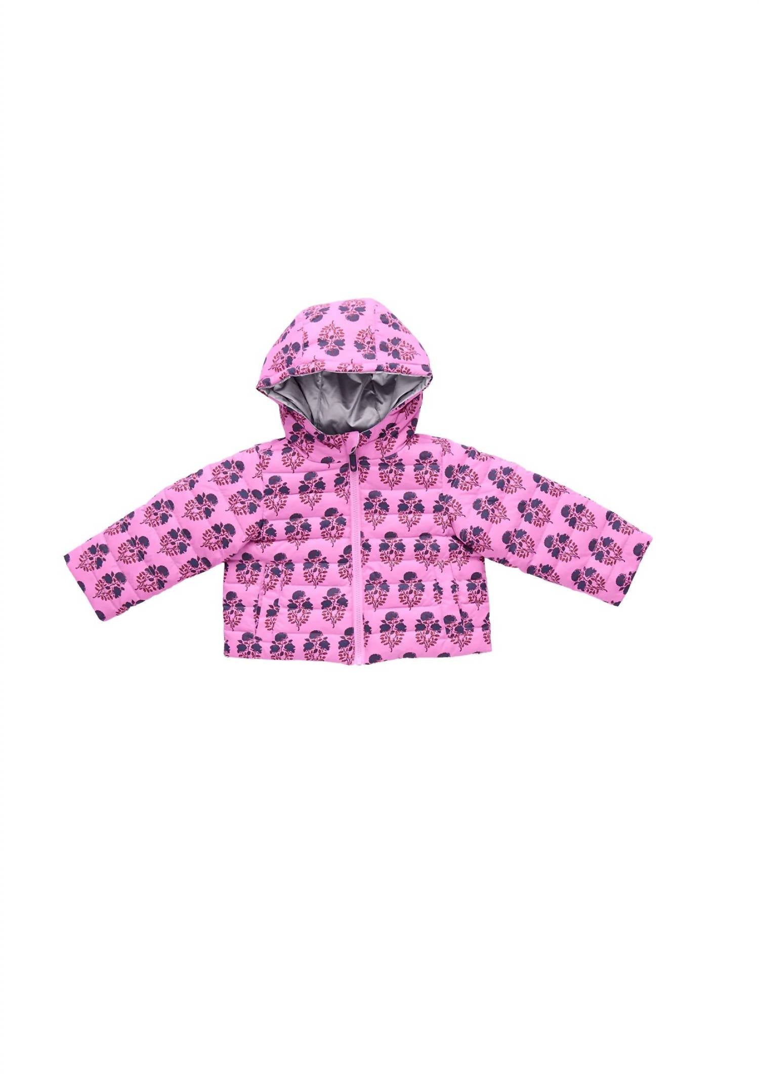 The ultimate cool-girl utility jacket. Introducing the Girl's Reversible Riley Jacket by Pink Chicken, an essential piece for versatile, stylish outerwear. This long sleeve, hooded jacket comes in Pink Strawflower and features a unique pattern that is perfect for both school days and fancy occasions. Designed with water resistance and filled with premium duck down, it ensures warmth without the bulk. Closure is secured with a zip, and care instructions suggest a machine wash followed by tumble drying.