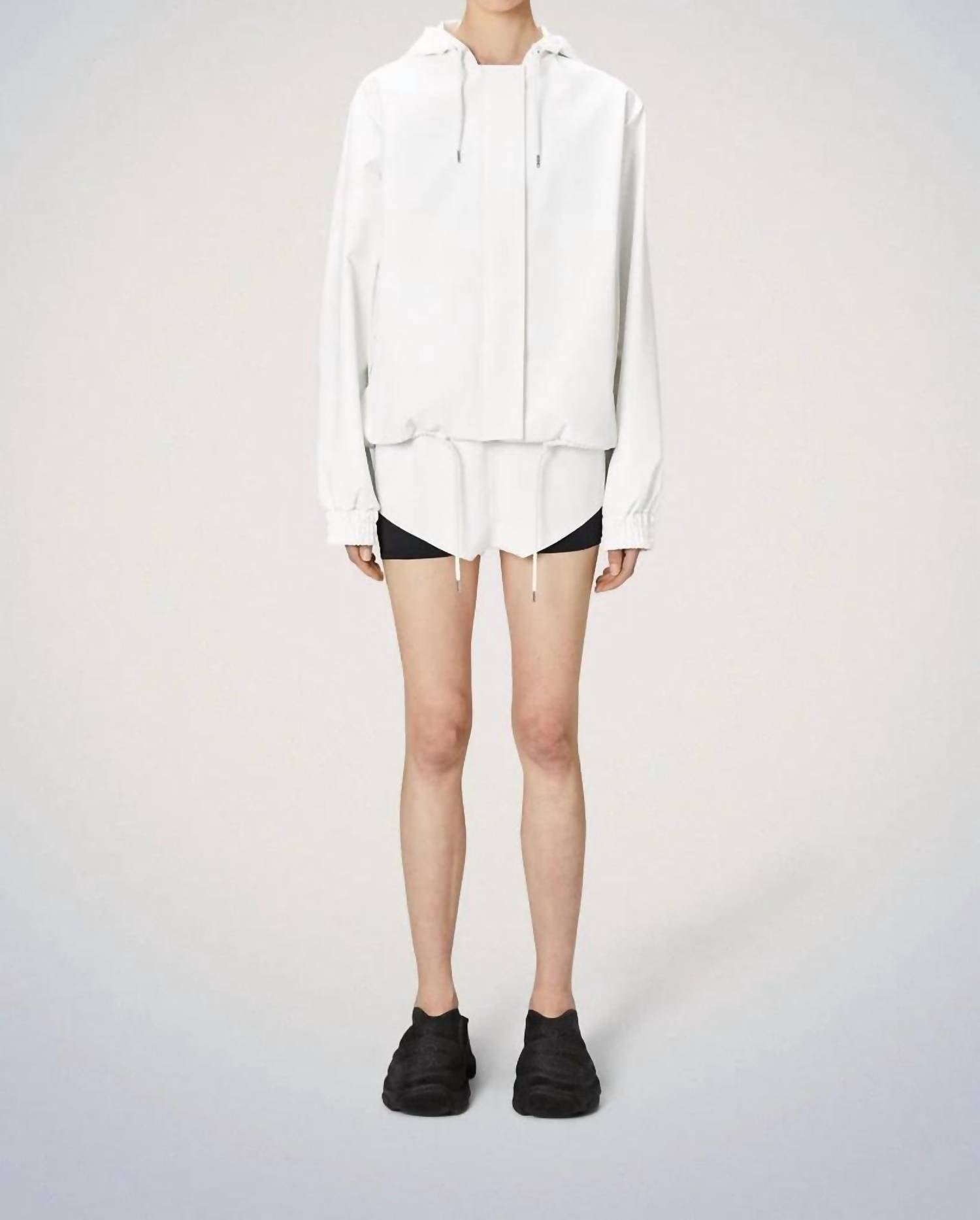 The coolest, most versatile utility jacket. Match it with your favorite pair of denim or throw it over any day dress. Introducing the String Parka Jacket by Rains, a stylish choice for your fall travels. This utility jacket in a powder hue features long sleeves and a hooded neckline for added protection. Made from durable 100% Polyester, it comes with a convenient snap closure and practical pockets. Care is a breeze with machine wash instructions, ensuring it remains your go-to piece throughout the season.