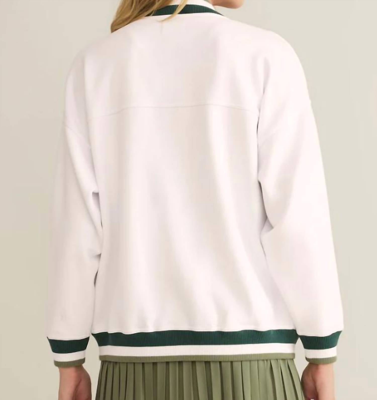 The varsity jacket is a trend that isn't going anywhere anytime soon and we are here for it! Unveil the timeless appeal of the Hampton Varsity Jacket by Z Supply, a chic addition to any wardrobe. This women's varsity jacket features long sleeves crafted from lux jersey fabric, composed of 70% Polyester, 25% Rayon, and 5% Spandex, providing both comfort and elasticity. Designed with bold accent stripes, a zip closure, and side seam pockets, it offers a sporty yet refined look. Care: Machine wash cold on a gentle cycle and hang to dry.