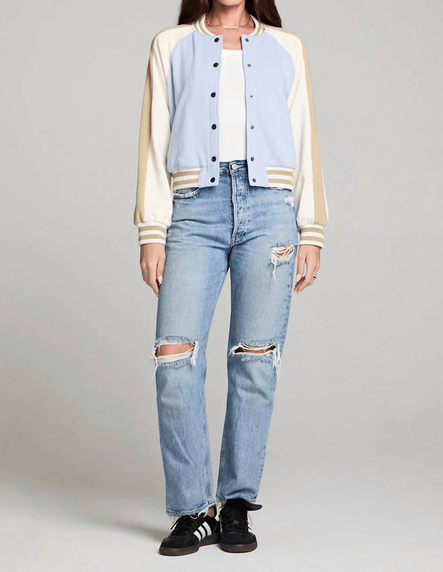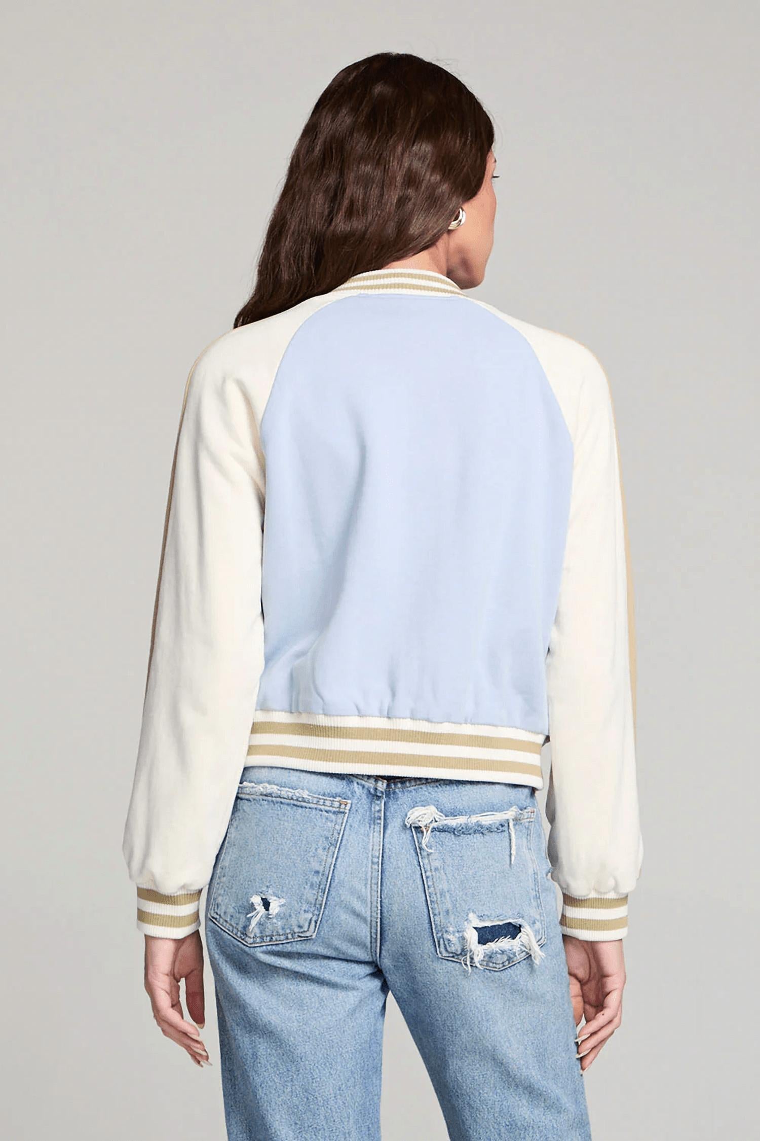 The varsity jacket is a trend that isn't going anywhere anytime soon and we are here for it! Discover the Autumn Jacket by Saltwater LUXE, a stylish blend of classic military tailoring with a streetwear twist. This varsity jacket features long gigot sleeves and a boxy fit, enhanced by color-blocked panels for added intrigue. Crafted from 100% cotton with a heavy sandwash finish and imported for exceptional quality. Closure: Snap closure. Care: Machine wash, tumble dry. Model is 5'9" and wearing a size small.
