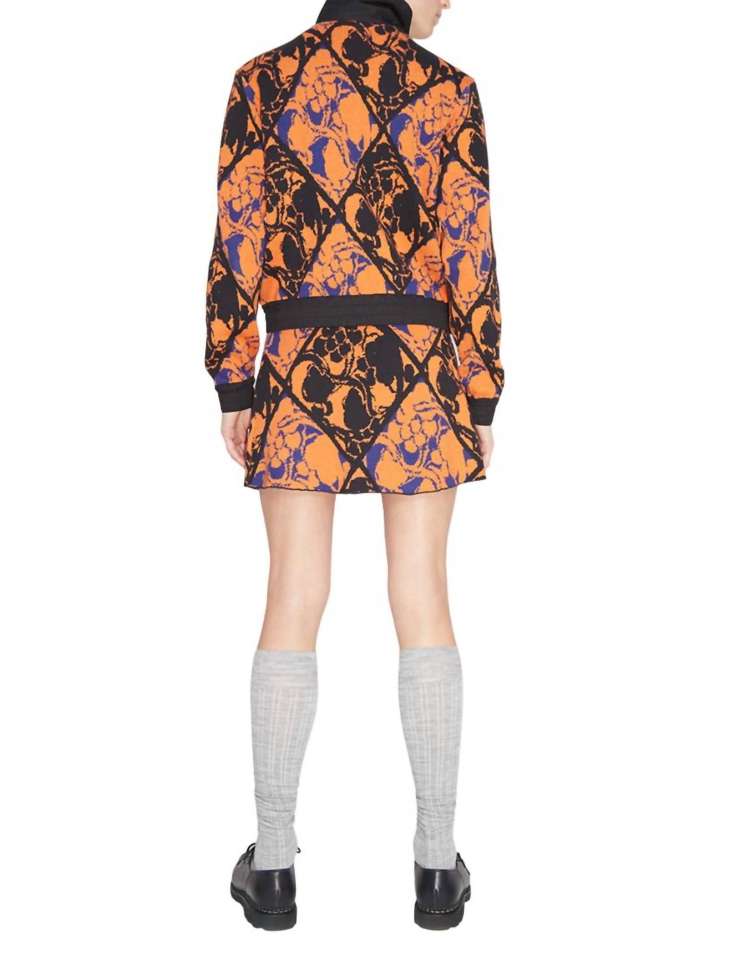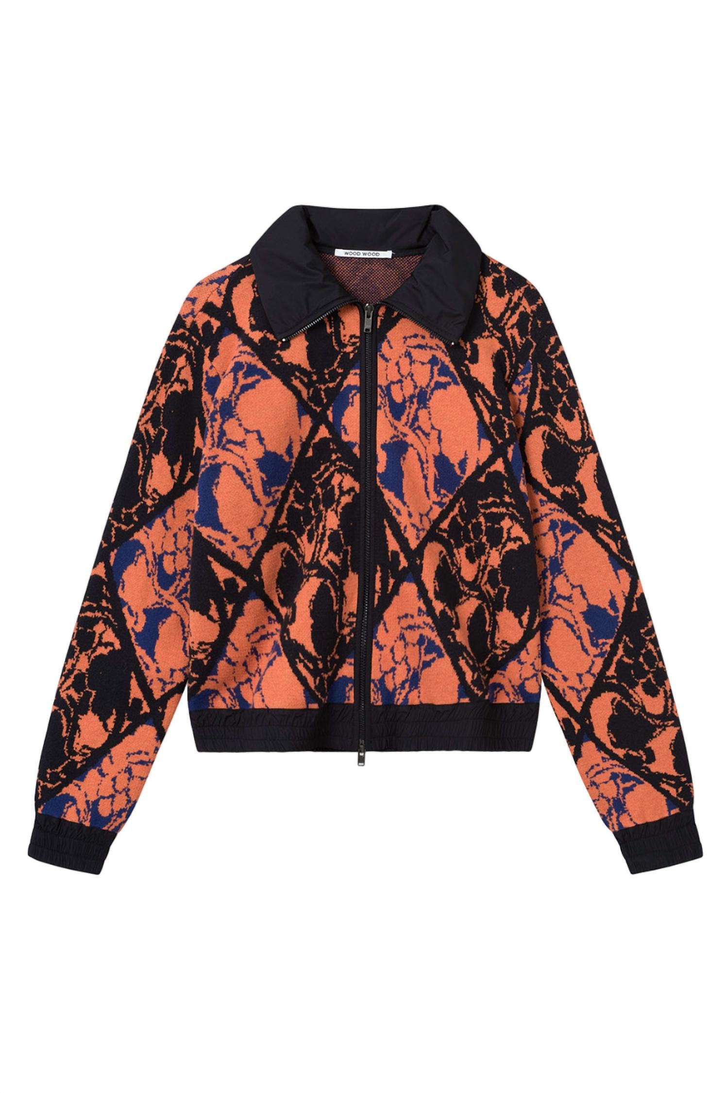 Jacquard track top in a relaxed fit. This style features a zipper, two pockets and a collar that can be folded up. Dry clean. 60% Cotton, 30% Nylon, 10% Merino wool.