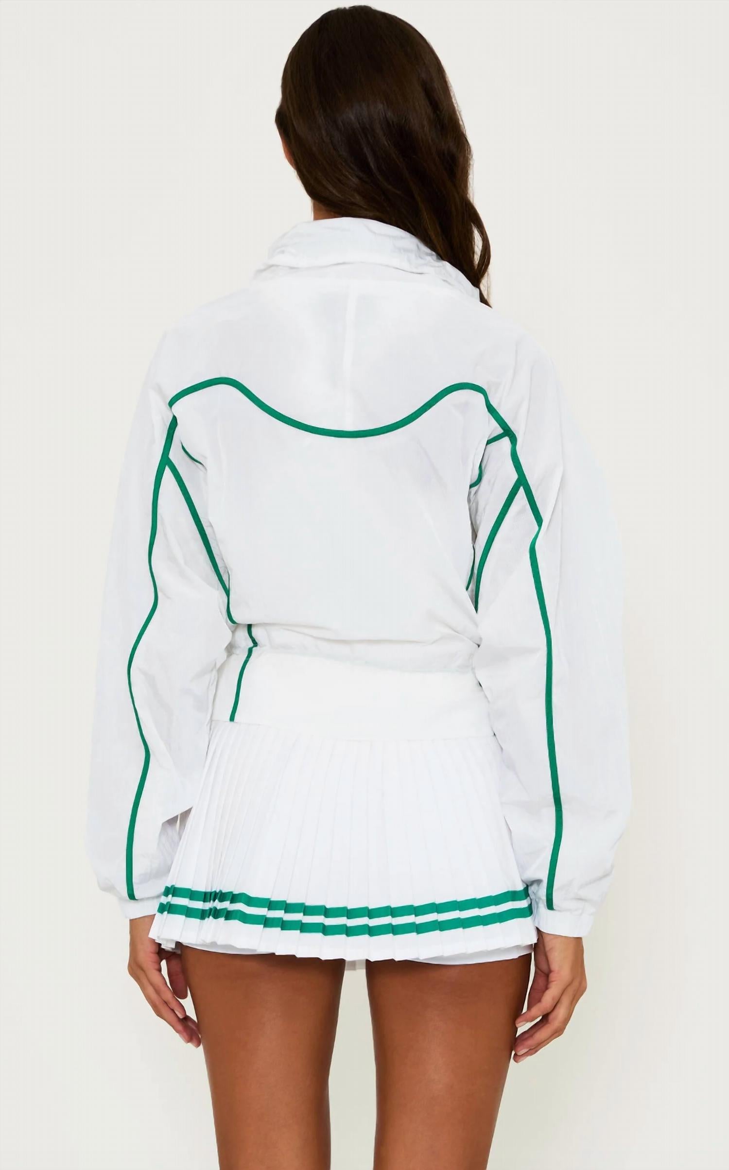 Giving off a vintage vibe, we love this varsity jacket style. Elevate your game-day style with the Casen Collar Jacket by Beach Riot, a chic streetwear piece in versatile white. This women's varsity jacket features a high neck collar and long sleeves with elasticated cuffs, offering both function and flair. Made from 100% nylon with a wicking finish and mesh lining, it ensures comfort throughout spring. Details include adjustable cords at the waist, side pockets, and a convenient zip closure. Model is wearing size small.