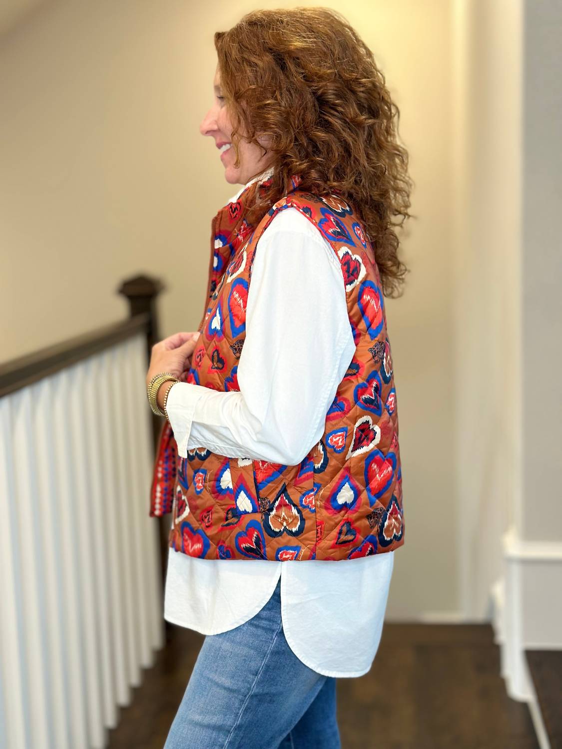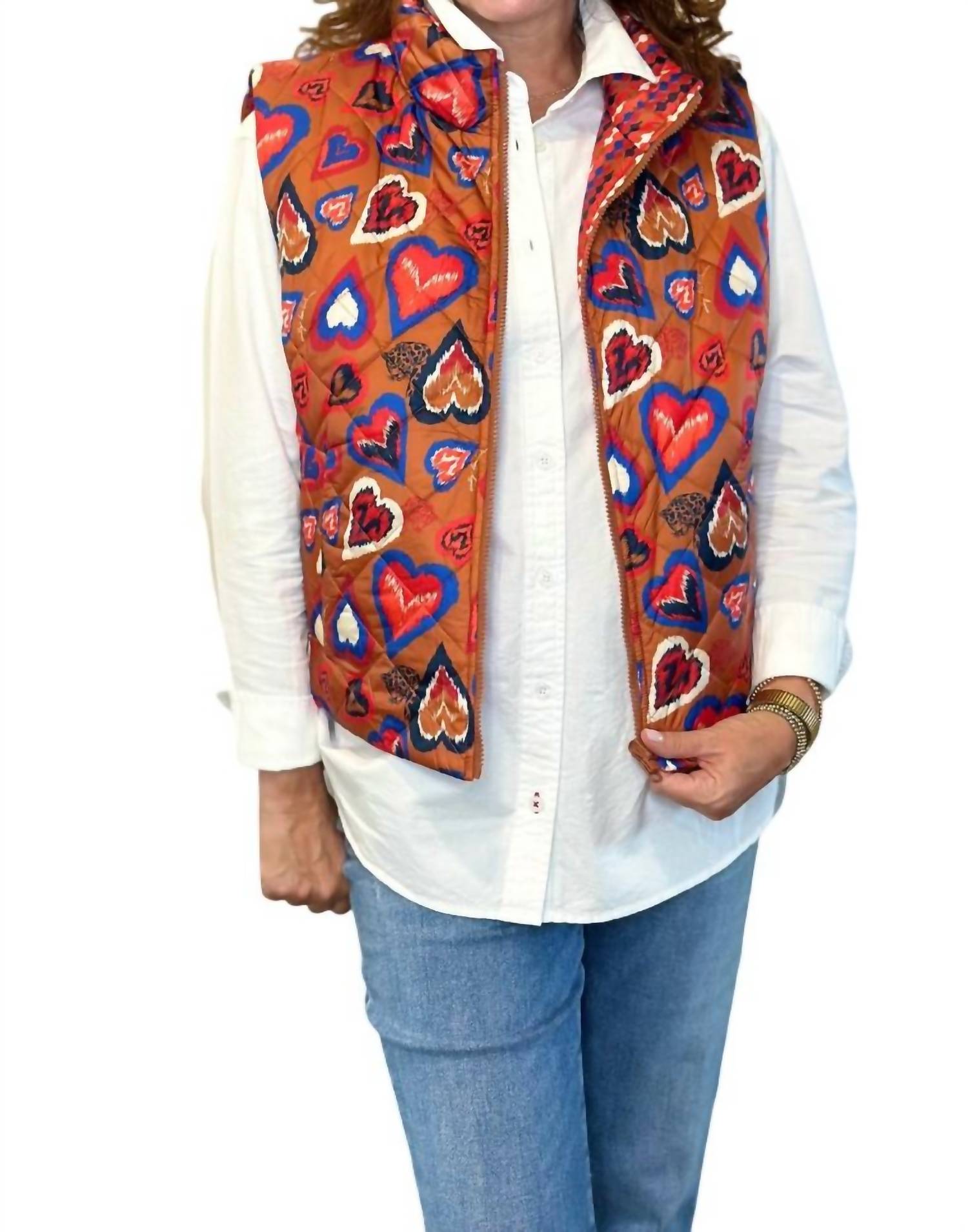 This sleeveless piece, crafted from 100% polyester, showcases a reversible design with geometric patterns and functional pockets on both sides. The vest features a convenient zip closure and offers styling versatility. It's advised to dry clean this. Model is 5'4" and wears a size small.