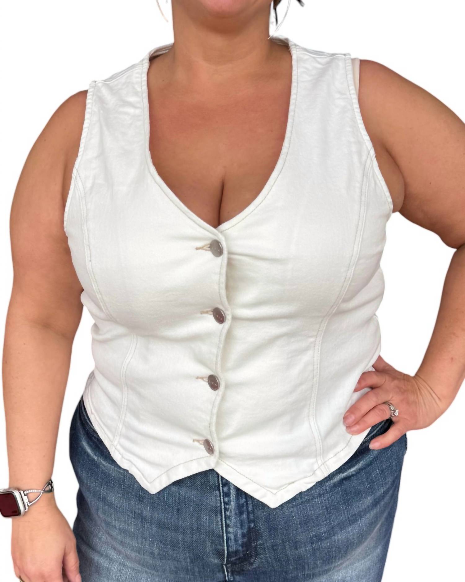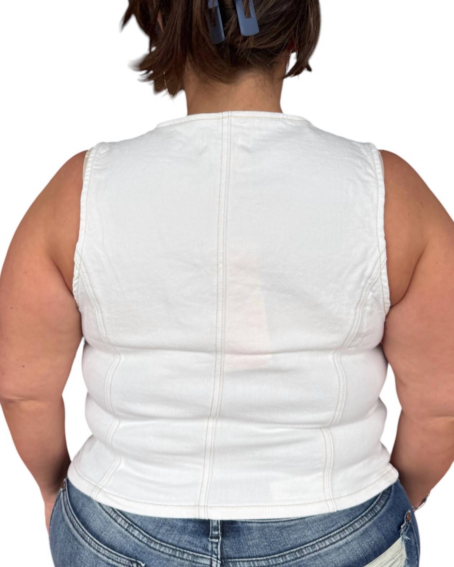 A vest so versatile you can mix and match it with almost any outfit and it will feel brand new every time. Introducing the RISEN Valerie Cropped Denim Vest in Cream, designed for effortless summer style in a boho chic aesthetic. This sleeveless, solid-colored vest features a flattering, fitted design with V-neck and a button closure, measuring 21 3/4" in length with a 35" chest for size S. Composed of a resilient cotton blend with 98% cotton and 2% spandex, it offers great stretch, making it perfect for layering. Care for this stylish piece is hassle-free with machine wash and tumble dry instructions, making it a vacation-friendly wardrobe staple.