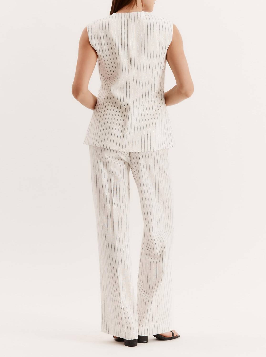 Throw this vest over an all black outfit for a perfectly polished look. Elevate your holiday party ensemble with the Cutter Vest by Tyler Boe, a chic layering piece in a timeless stripe pattern. This sleeveless vest features a classic crewneck and a stylish front button placket that effortlessly merges function with flair. Constructed from a blend of 72% Rayon and 28% Linen, with a 100% Polyester lining, this piece showcases practical buttoned front pockets and a contemporary front slit. Care for this sophisticated A-line silhouette by opting for dry cleaning only, ensuring its elegant appeal endures.