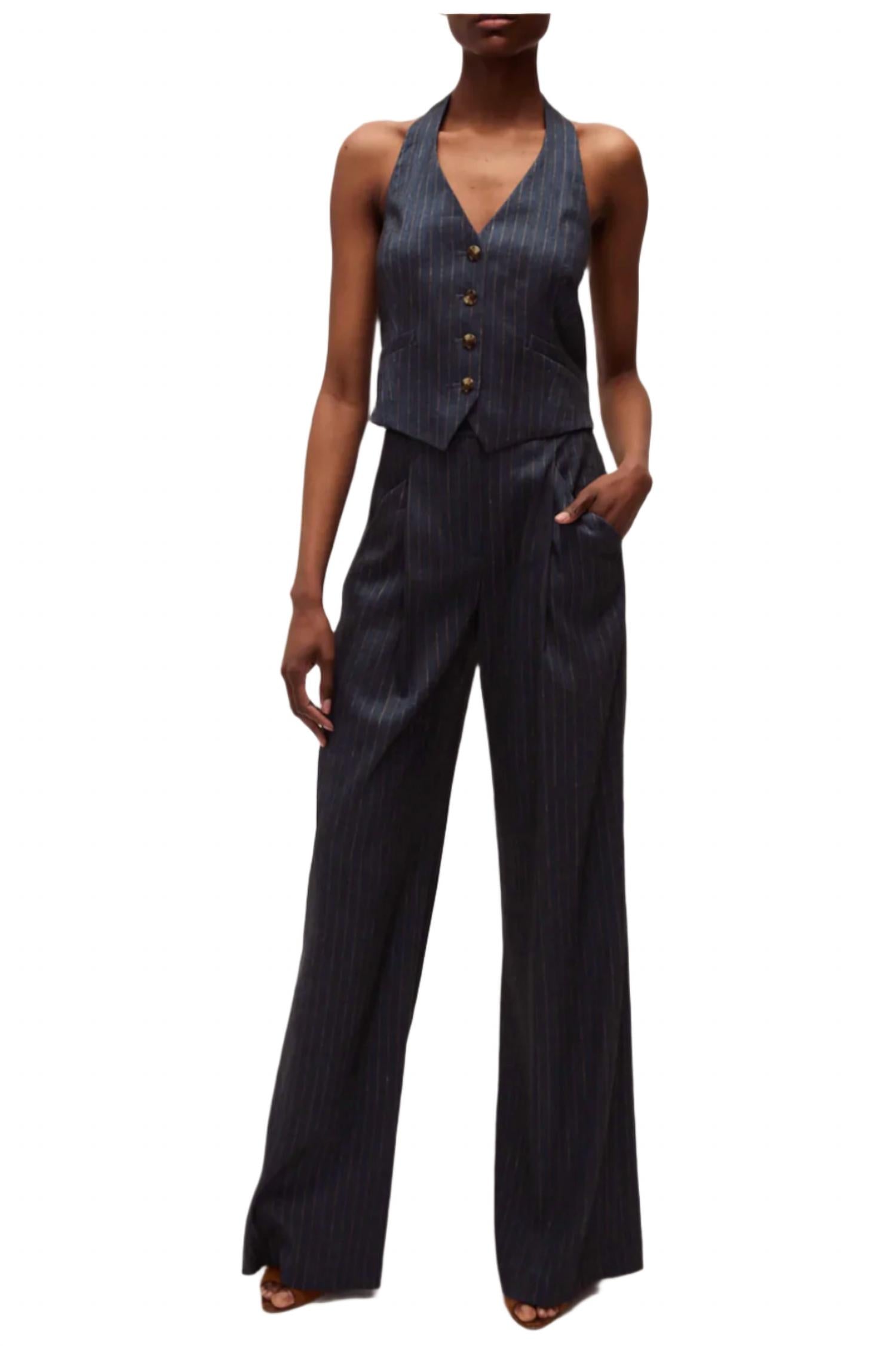 That extra layering piece you didn't know you needed! Elevate your summer ensemble with the Arabella Vest by Veronica Beard, a sophisticated choice in classic pinstripe. This sleeveless vest is crafted from a premium Italian stretch linen blend of 58% Linen, 40% Viscose, and 2% Elastane, delivering comfort and a tailored cropped fit. Featuring a halter neckline, adjustable back strap, welt pockets, and a button-front closure, it exudes refined style. Originating from Italy and maintaining its elegance through dry cleaning, the vest is lined with 100% Viscose for a luxurious finish.