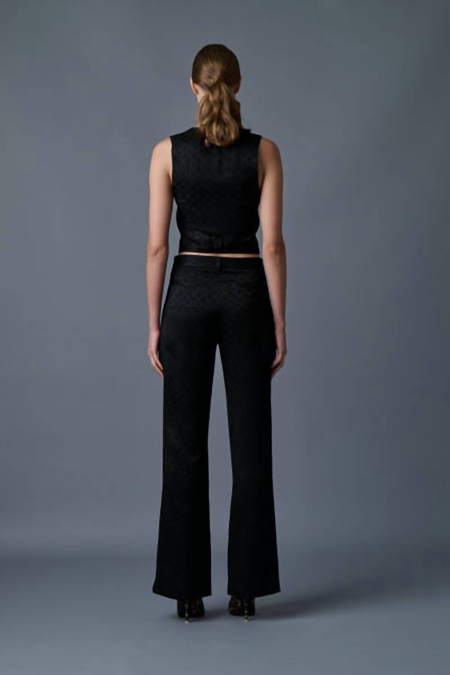 A vest so versatile you can mix and match it with almost any outfit and it will feel brand new every time. Enhance your wardrobe with the LE SUPERBE Future Foulard Vest, a chic addition in an exclusive black silk foulard print designed for women. This sleeveless vest boasts a cropped length and is crafted from a luxe blend of 51% acetate, 45% viscose, and 4% acrylic. The button closure adds a touch of elegance, complemented by a sharp V-neckline for versatile styling. Model is wearing size 4, with dimensions: 5'10" height, 32" bust, 24.5" waist, 34.5" hip.