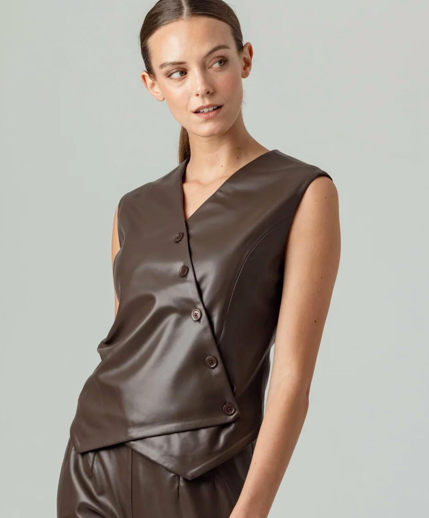 A vest so versatile you can mix and match it with almost any outfit and it will feel brand new every time. Elevate your evening ensemble with the Joelle Vest by Sundays, a sophisticated piece crafted in luxurious chocolate brown faux leather. This sleeveless vest features a chic V-neck design and is tailored for a minimalist aesthetic, perfect for spring occasions. Made for women, it boasts a button closure for an elegant finish. Care is simple with machine wash instructions.