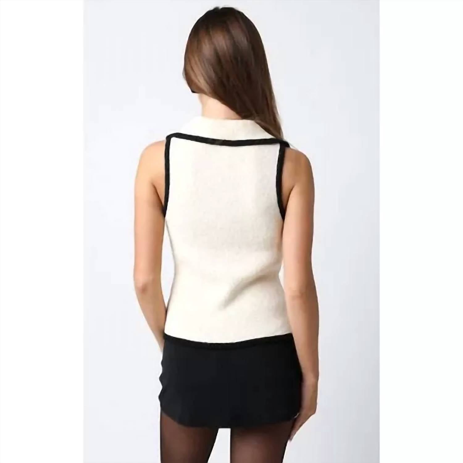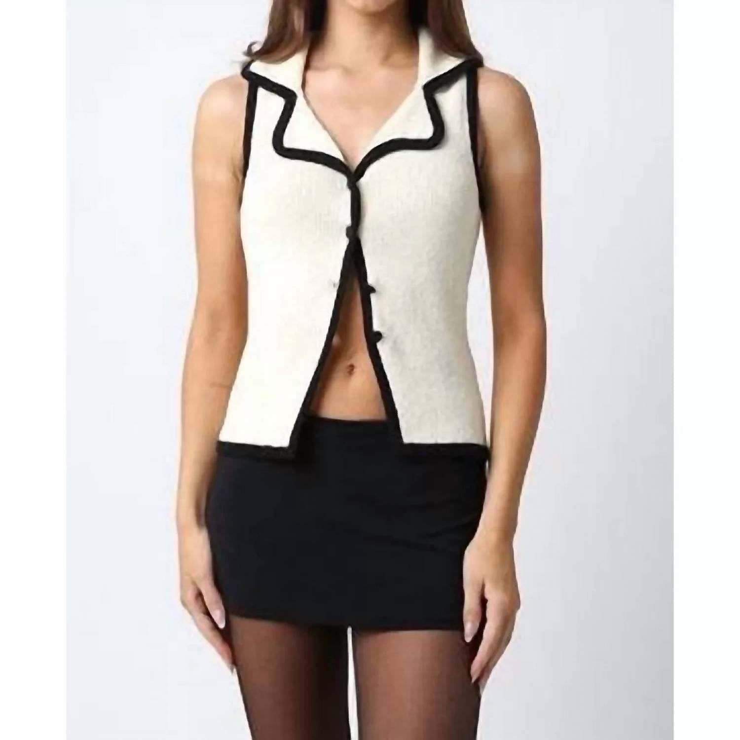 That extra layering piece you didn't know you needed! Meet the Button Up Sweater Vest by Olivaceous, an adorable piece perfect for adding charm to any outfit. This sleeveless, cream and black vest features a stylish collar and black piping detail, offering a textured pattern for a distinctive look. Easy to wear with a button closure, it's crafted to run true to size. Care: Machine wash and line dry for convenience.