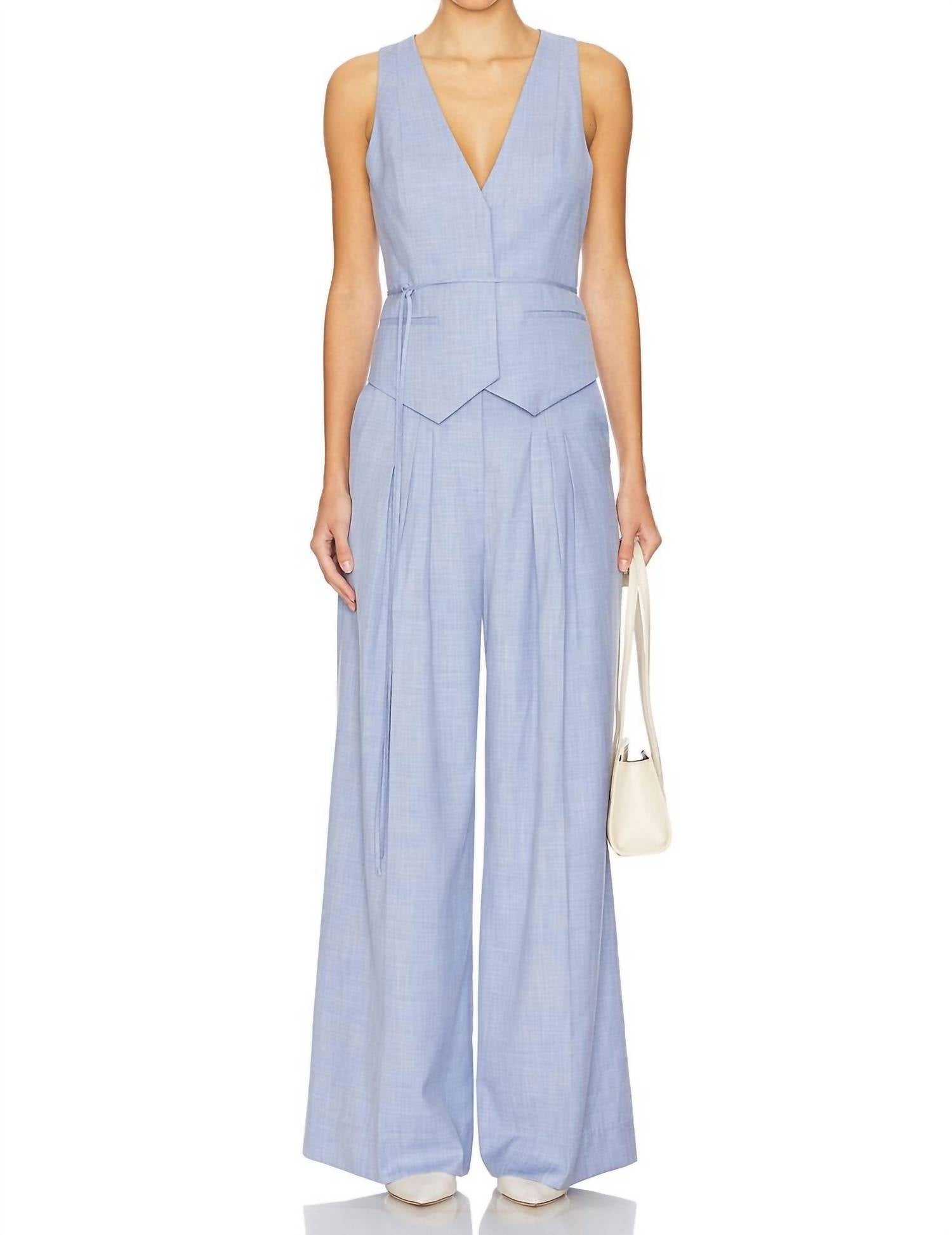 Throw this vest over an all black outfit for a perfectly polished look. The Asher Belted Vest by Shona Joy is a sophisticated addition to your workwear wardrobe in a chic chambray blue. Crafted from 79% polyester, 17% viscose, and 4% elastane, this sleeveless vest features a hidden front button closure and an optional tie-up accent, offering a tailored fit. Made in China, it boasts solid crepe fabric and includes practical pockets. For care, please hand wash to maintain its quality.