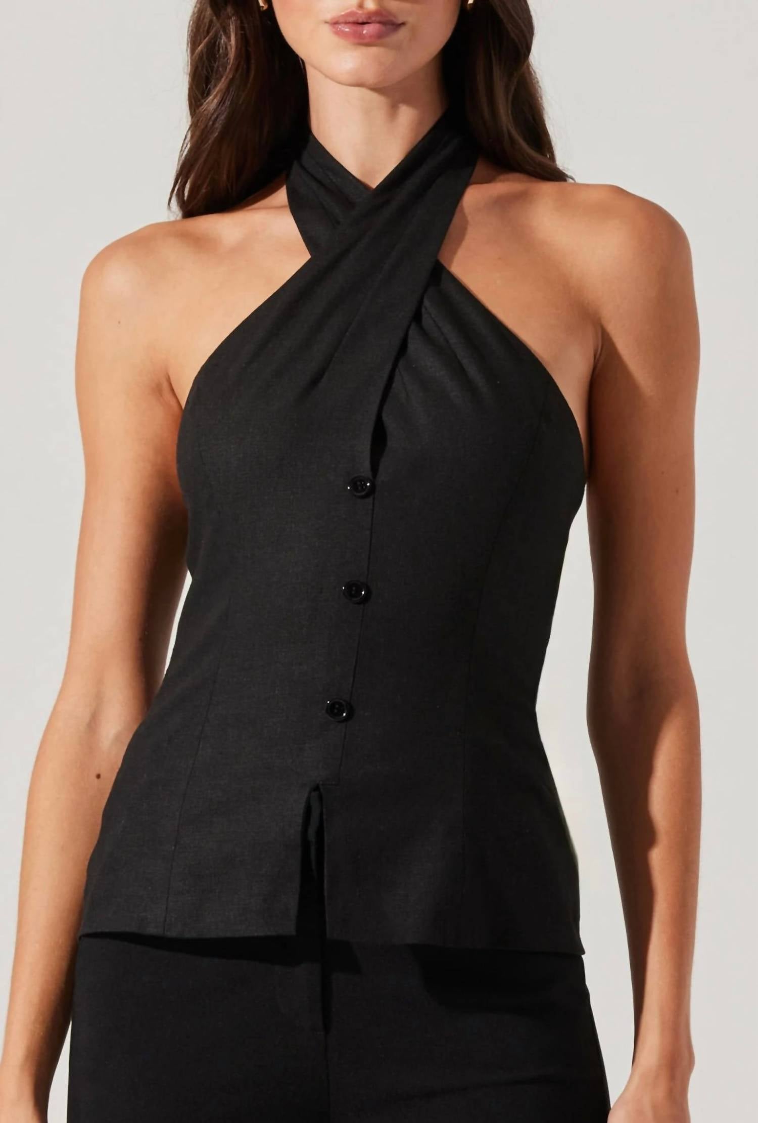 Throw this vest over an all black outfit for a perfectly polished look. Discover the Yaritza Crossover Linen Blend Vest by ASTR, a sophisticated addition to your wardrobe with its sleeveless halter neck and adjustable tie strap. Crafted from a premium blend of 55% linen, 42% viscose, and 3% elastane, it features a fully lined 100% rayon interior for comfort. This vest boasts a concealed back zipper closure and faux button accents that add a touch of elegance. Ideal for spring occasions, its refined tailoring and unique cutout hem make it perfect for dinner parties.