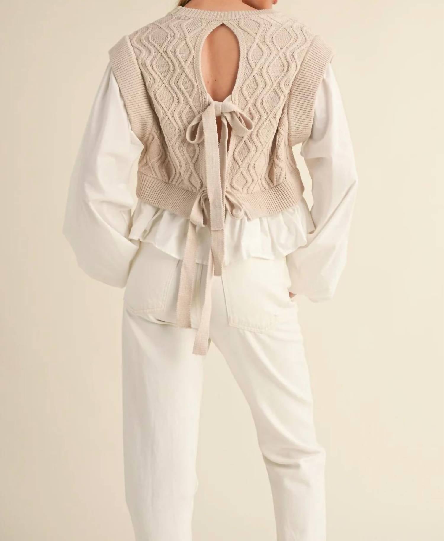 That extra layering piece you didn't know you needed! Striking addition to your workwear collection in a textured khaki hue. Unique piece combines a cable knit with a poplin woven balloon sleeve mix top, featuring a stylish open back with self-tie detail. Pull On. Hand wash. Perfect for travel and smart winter occasions.