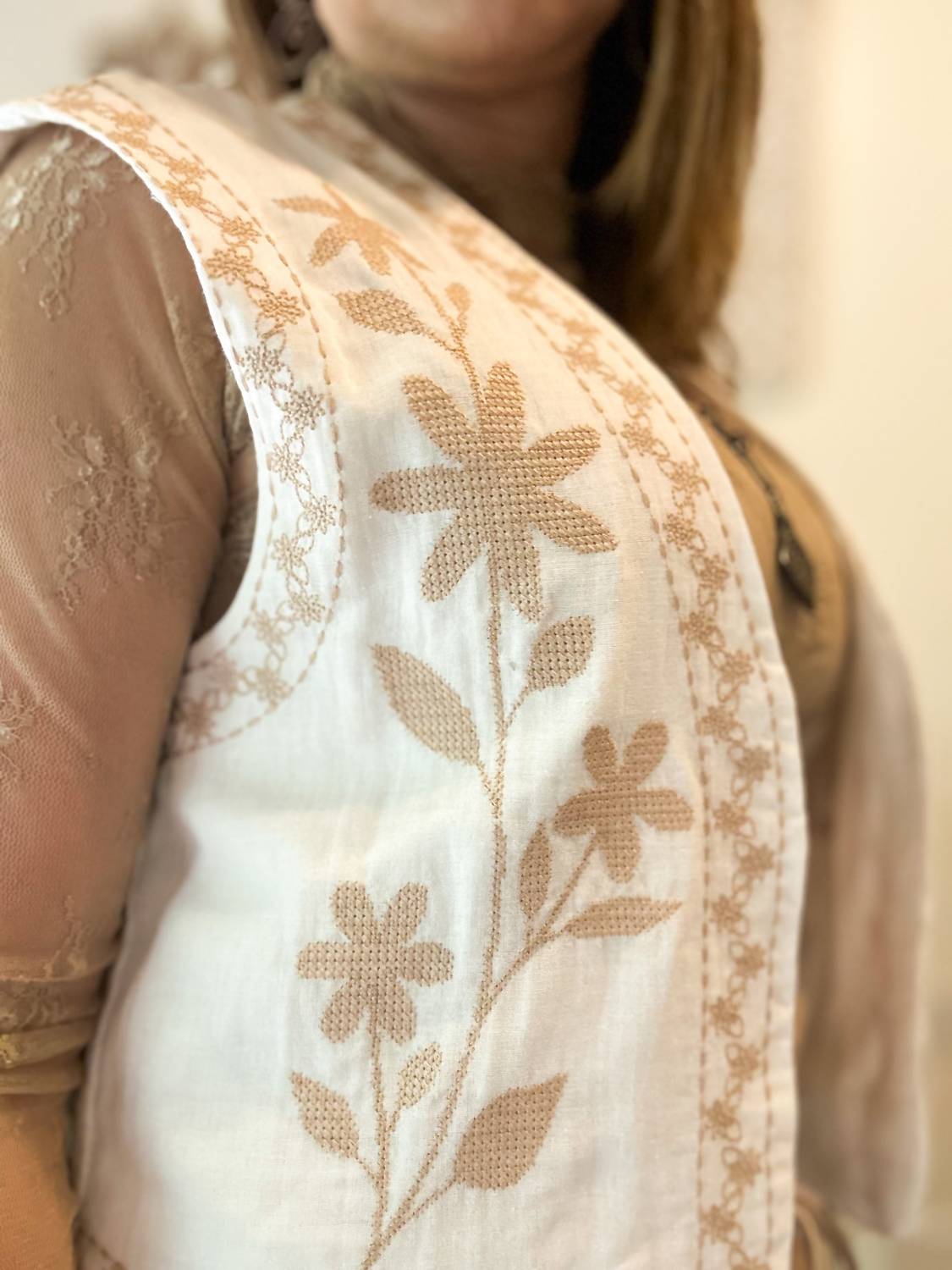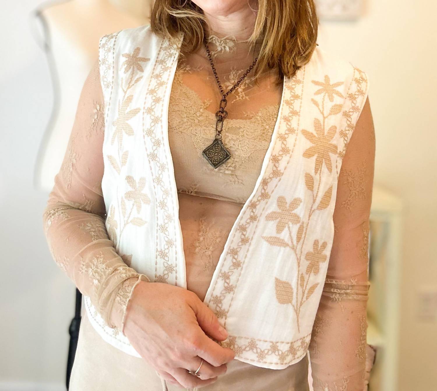A vest so versatile you can mix and match it with almost any outfit and it will feel brand new every time. Add a touch of timeless femininity to your look with our Embroidered Floral Vest. Made in a soft ivory fabric, this lightweight layering piece is adorned with intricate taupe floral embroidery across the front, bringing texture and elegance to any outfit. An embroidered trim frames the edges both front and back, giving it a beautifully finished look. Whether layered over a flowing dress, paired with jeans or worn with a skirt for a more polished style, this vest is a versatile piece that transforms simple outfits into something special. Graceful, delicate, and beautifully made, it’s the perfect finishing layer for the woman who loves understated elegance. Fabric: 100% Cotton; Lining: 100% Rayon