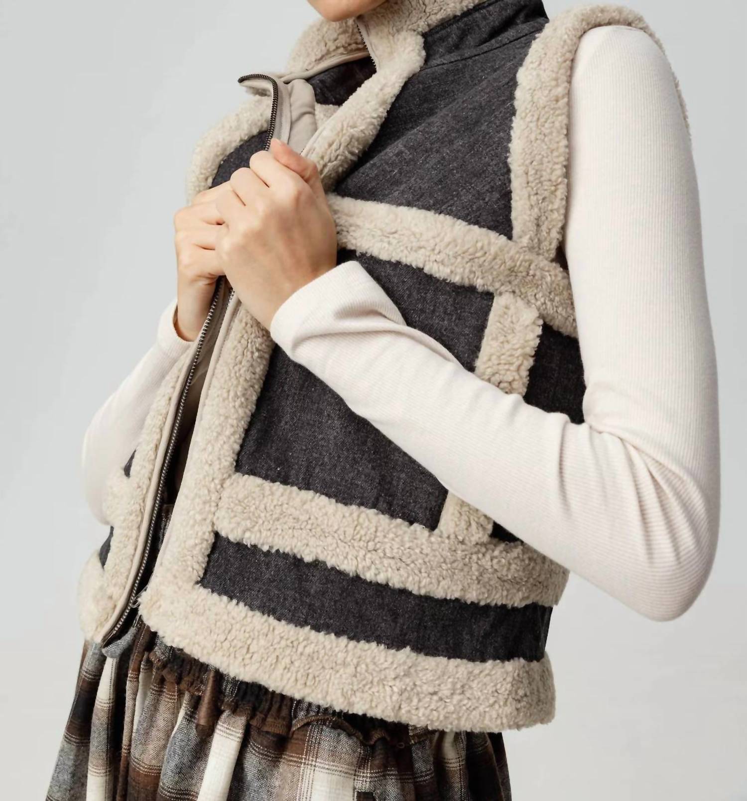 Meet the Greta Vest by Sundays, a chic and versatile piece in Dark Denim. This sleeveless vest is expertly crafted with 100% polyester, offering a cozy feel and textured finish with its charcoal denim and sherpa accents. Its zip closure, collared neckline, and pockets elevate its exclusivity, making it perfect for a fashion-forward wardrobe. Easy to care for, simply machine wash and tumble dry for continuous wear.