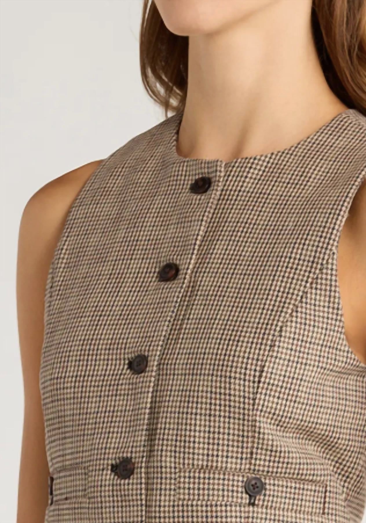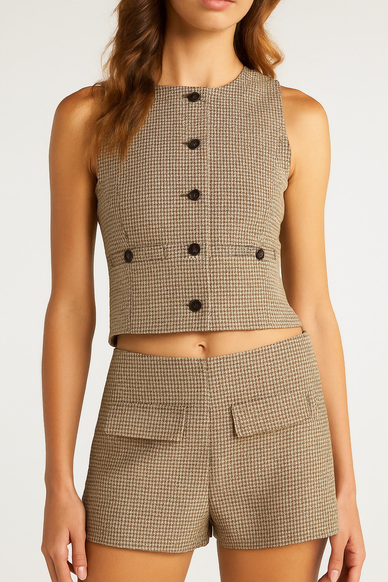That extra layering piece you didn't know you needed! Elevate your preppy style with the BLANKNYC Between The Lines Vest Top, a chic addition for your back-to-school wardrobe. This sleeveless tan gingham vest, crafted from a cozy wool blend of 70% polyester and 30% wool, offers both comfort and style. Featuring a crewneck design and button closure, this piece is perfect for layering. Care for it with dry cleaning to maintain its classic appeal.