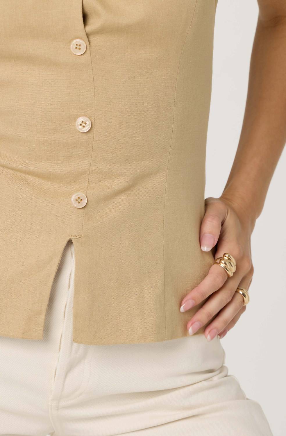 A vest so versatile you can mix and match it with almost any outfit and it will feel brand new every time. Unveil sophistication with the ASTR Yaritza Vest, a must-have for dinners and special occasions. This striking vest in classic black features a sleeveless design with a chic halter neck and an adjustable tie closure, perfect for a personalized fit. The crossover silhouette delights with a faux button detail and a cutout at the bottom front hemline, while the smocked back ensures a comfortable, flattering shape. Crafted from a luxurious linen blend with a fully lined structure, this piece requires dry clean care for long-lasting wear.
