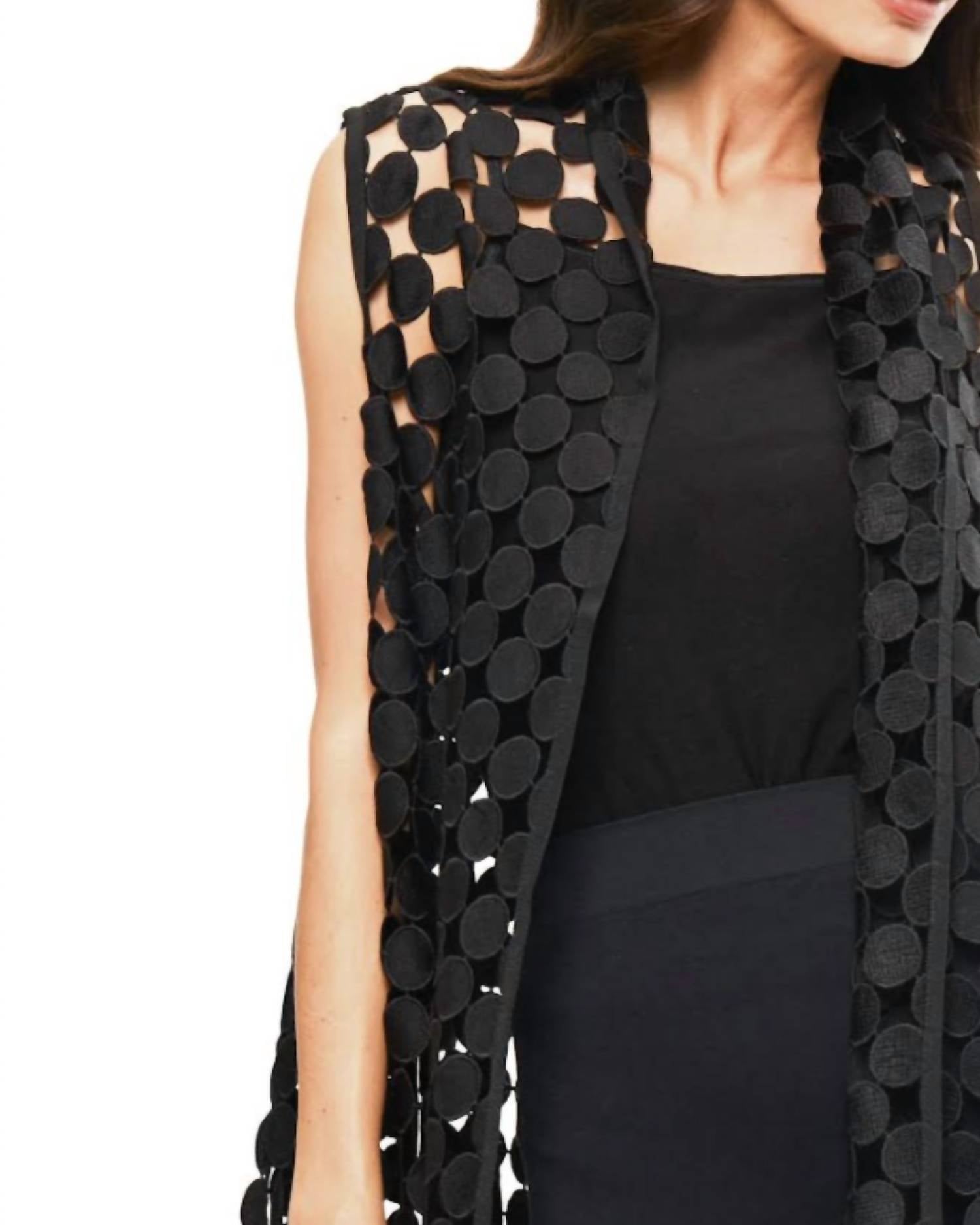 Throw this vest over an all black outfit for a perfectly polished look. Elevate your summer vacation wardrobe with the Adore Circle Open Vest, perfect for embracing minimalist trends. This sleeveless vest in classic black features a textured pattern that adds subtle sophistication to any outfit. Designed for easy wear, it comes with a pull-on closure and boasts a chic V-neckline, ideal for a stylish Thanksgiving holiday gathering.