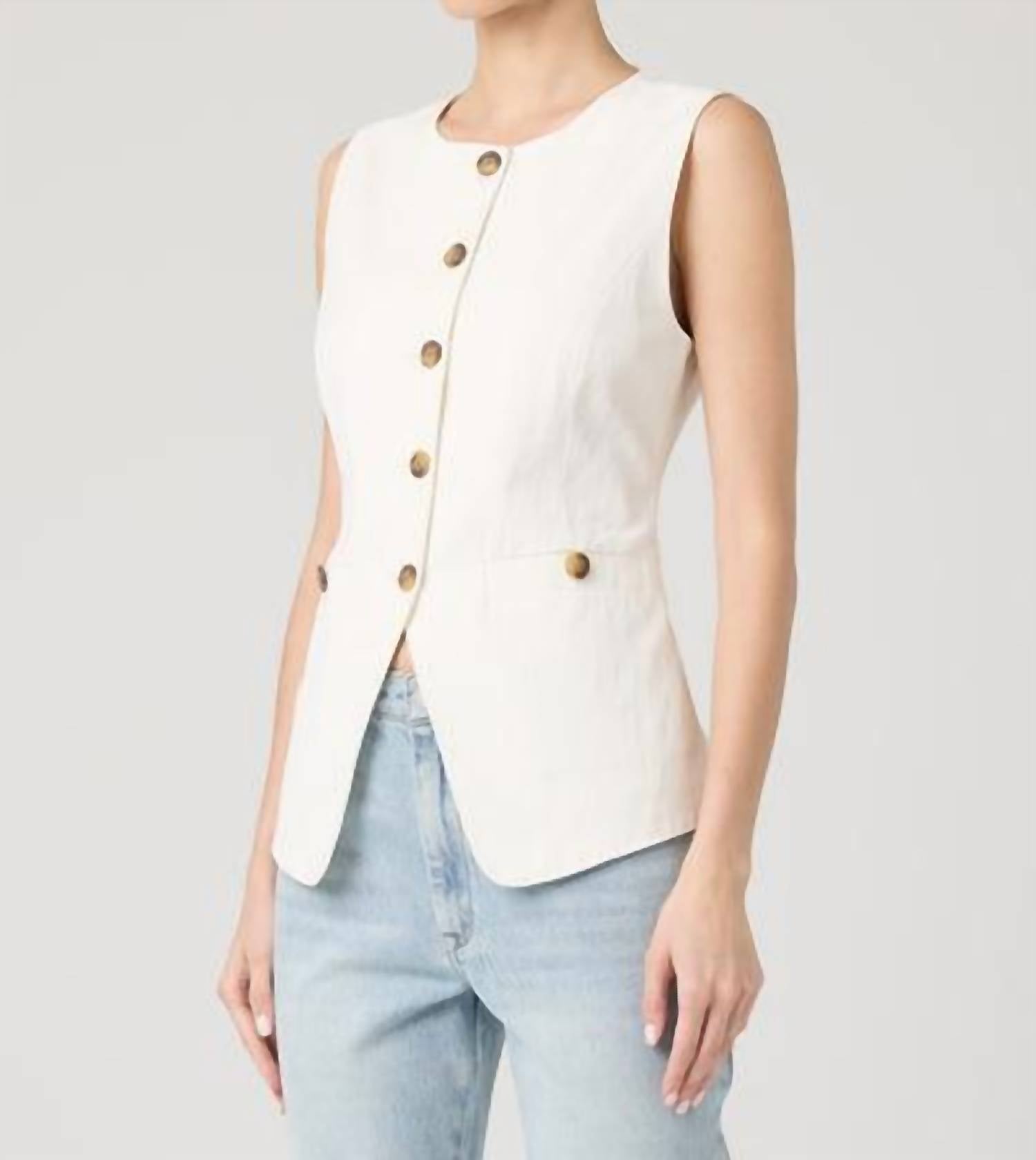 Throw this vest over an all black outfit for a perfectly polished look. The Cloud Burst Long Denim Vest by BLANKNYC is a stylish addition to any wardrobe, offering a sleek, sleeveless silhouette perfect for an evening event. Made from a cotton blend with a classic front button closure, this vest combines effortless style with practical functionality. It features front seam pockets with button closures, adding convenience and charm to the solid linen fabric. Care for this versatile piece with ease, as it is machine washable, ensuring it remains a staple in your spring workwear collection.