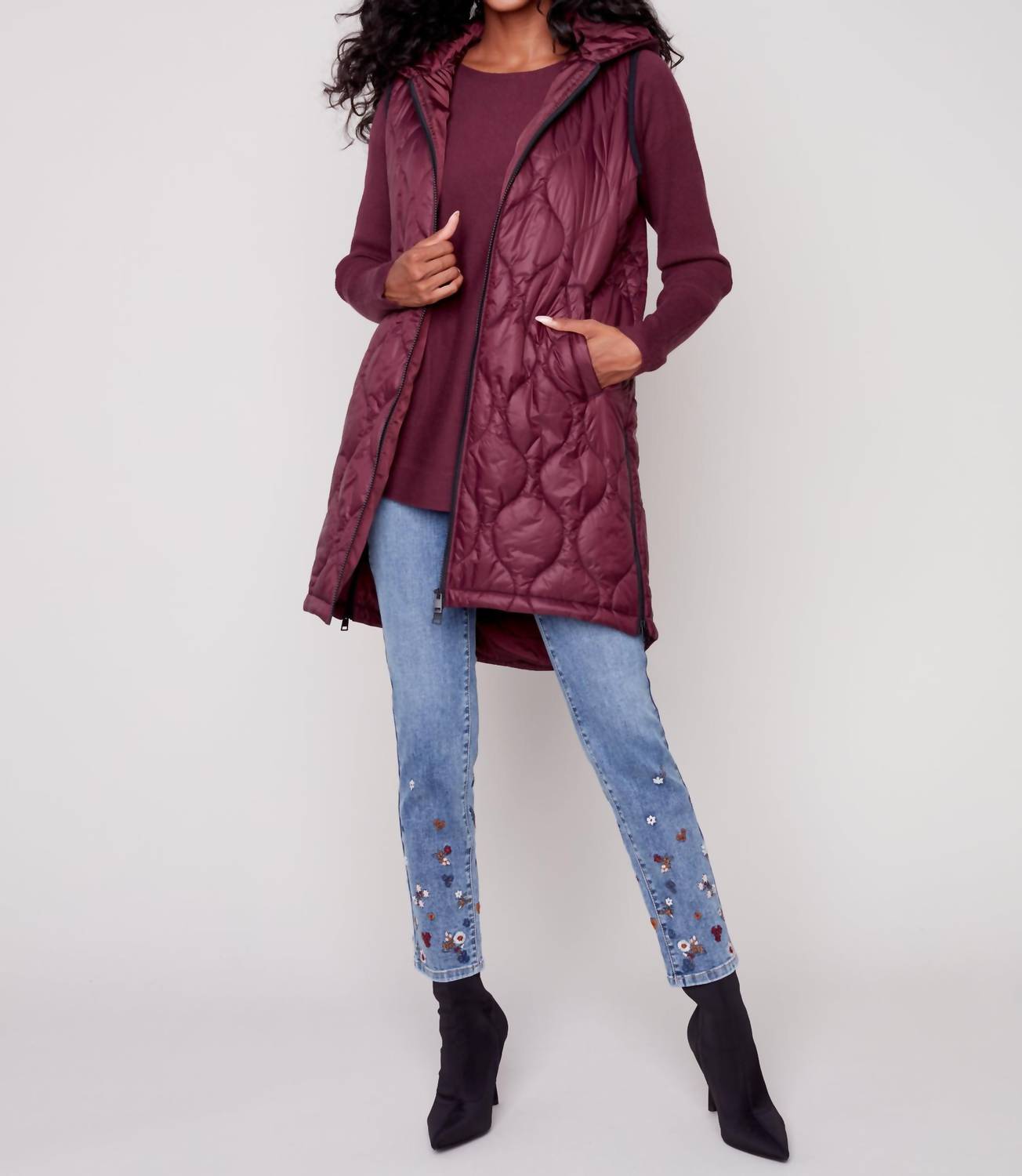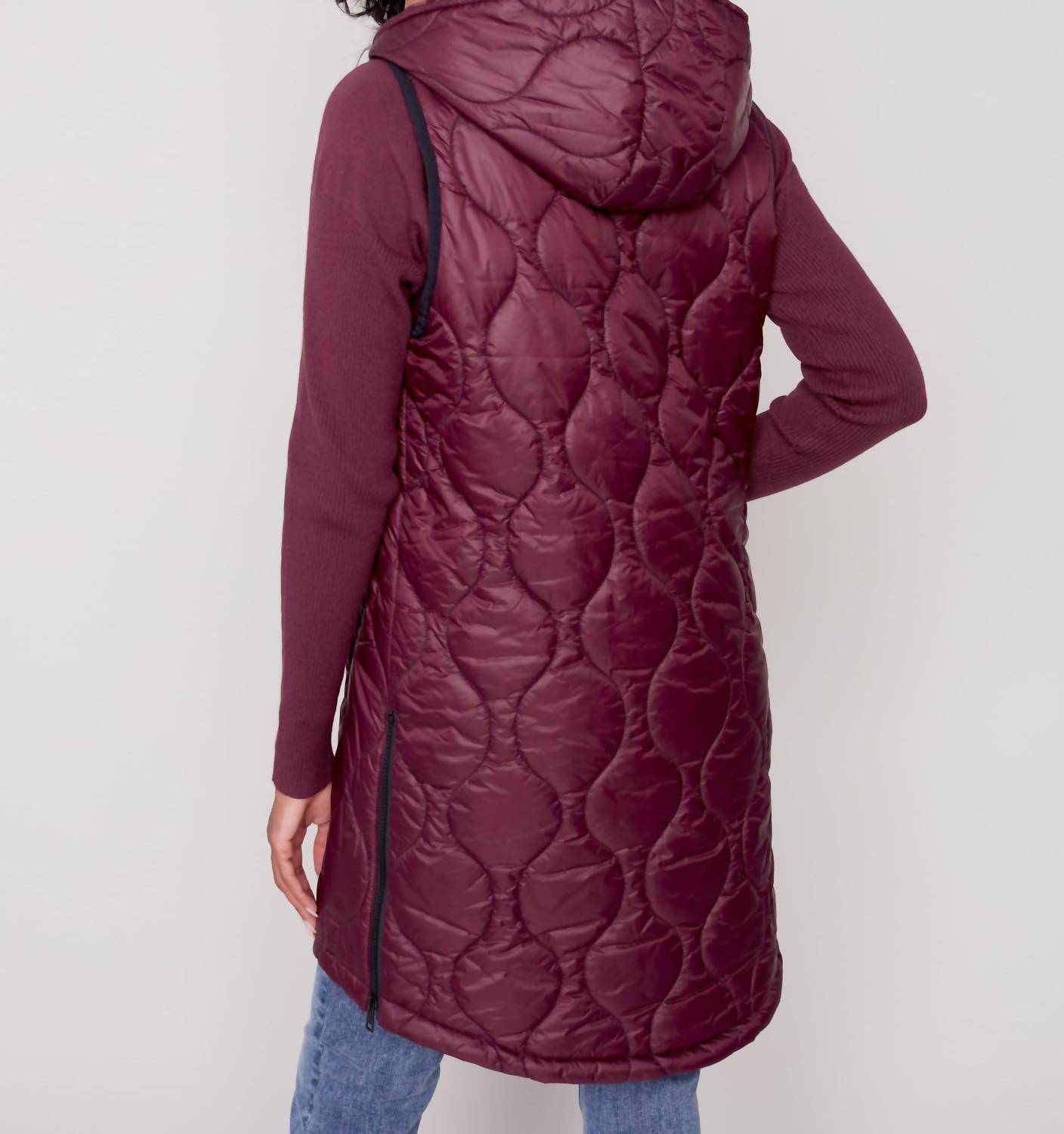 A vest so versatile you can mix and match it with almost any outfit and it will feel brand new every time. Welcome the fall season in style with the Hooded Sleeveless Quilted Long Vest by CHARLIE B, presented in a rich wine hue. Crafted from durable nylon, this minimalist vest offers a cozy, quilted design, perfect for travel and Thanksgiving gatherings. Its practical zip closure and functional pockets add convenience to your adventures, while the hooded neckline provides extra warmth. Ideal for layering, this solid pattern vest is a must-have addition to your fall wardrobe.