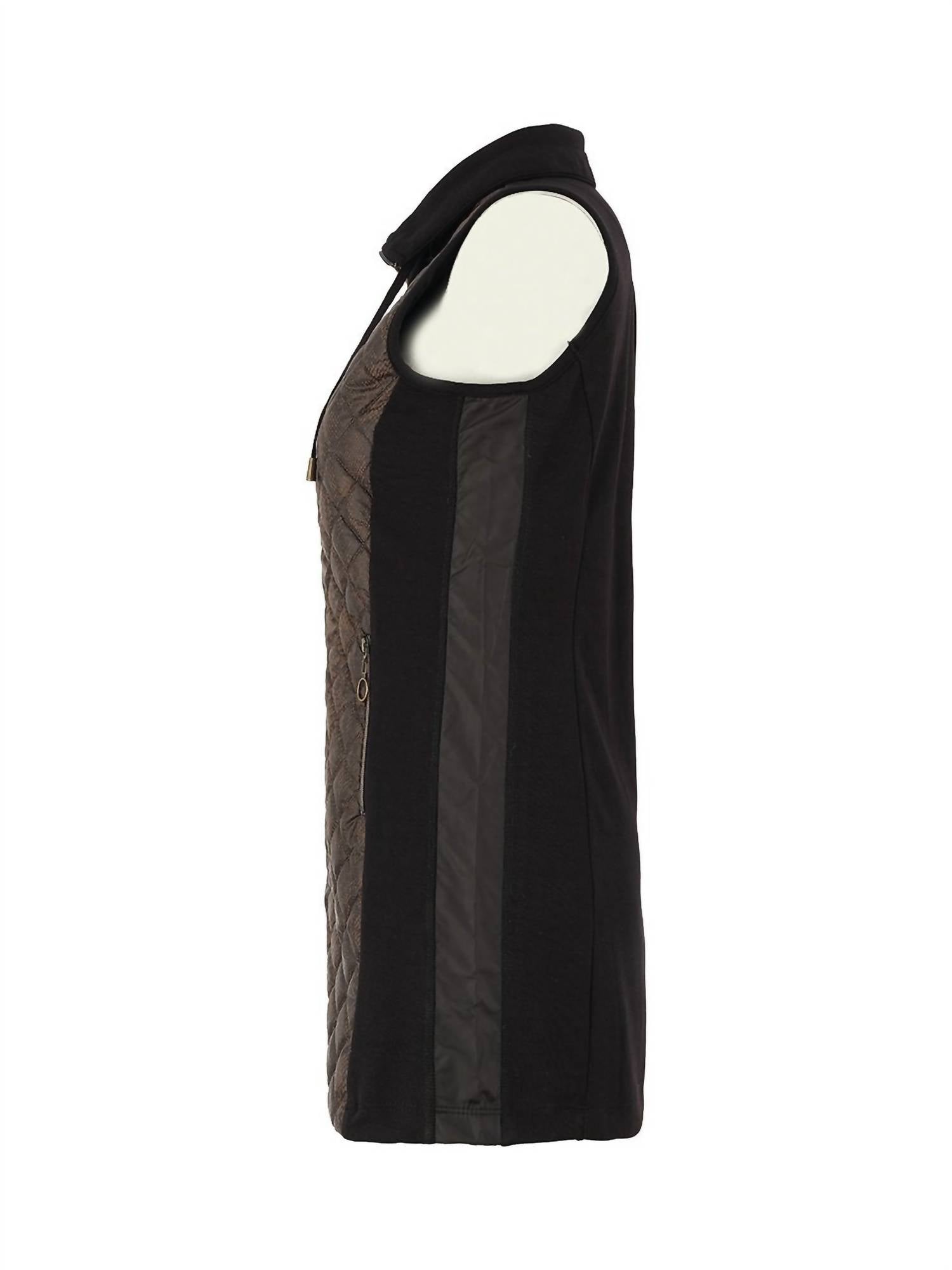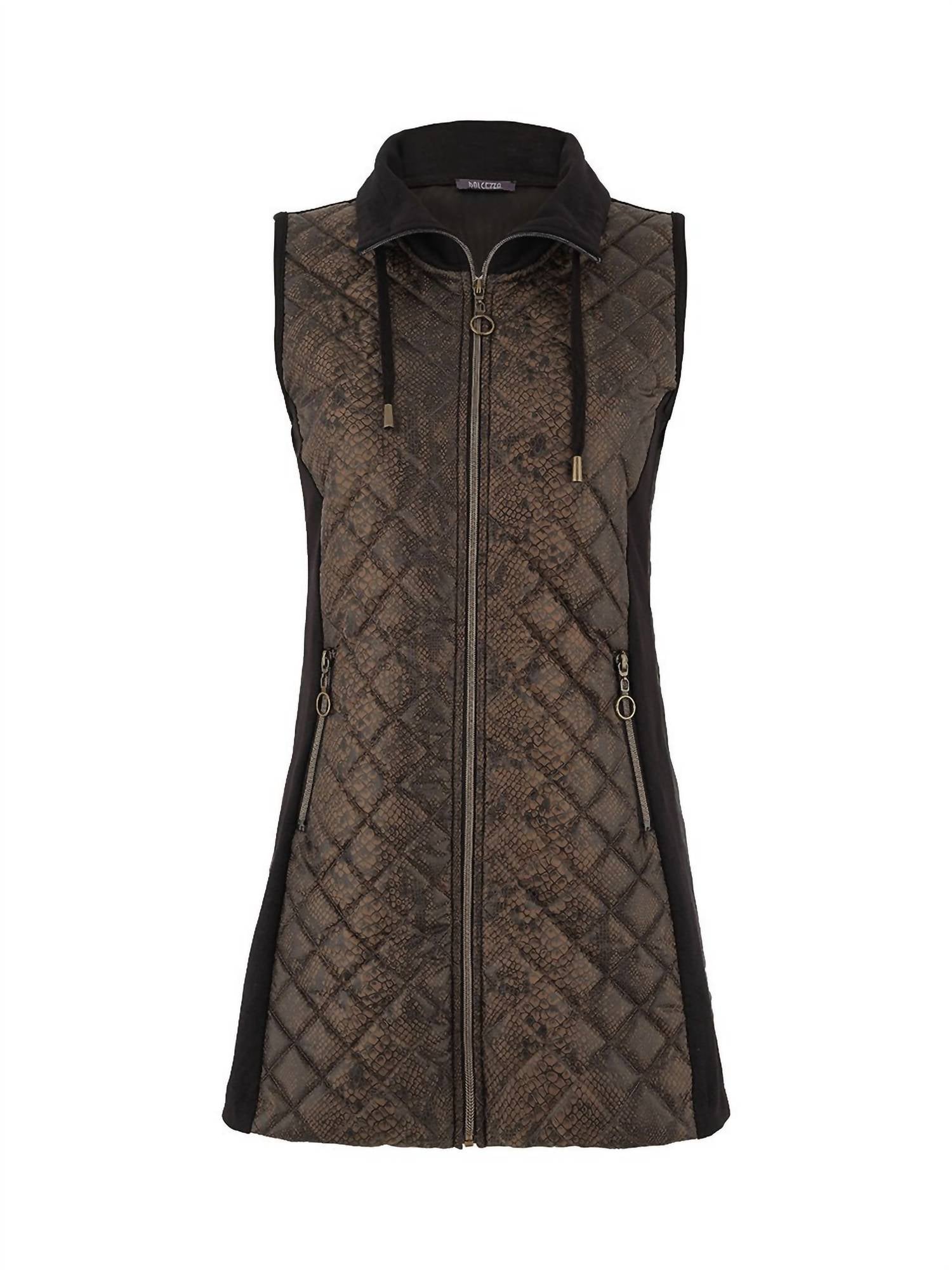 A vest so versatile you can mix and match it with almost any outfit and it will feel brand new every time. Elevate your layering with the DOLCEZZA Women's City Rock Longline Puffer Vest in Black Khaki, a striking sleeveless design perfect for winter and urban streetwear. Crafted from a blend of 45% Modal, 45% Polyester, and 10% Elastane, this vest features a longline silhouette at approximately 31” in length and a quilted reptile print front. Made with a full front zipper closure, it boasts a practical stand-up foldable drawstring neckline and two front zip pockets. Ideal for New Year's Eve outfits, it embodies urban-chic style without compromise on comfort.