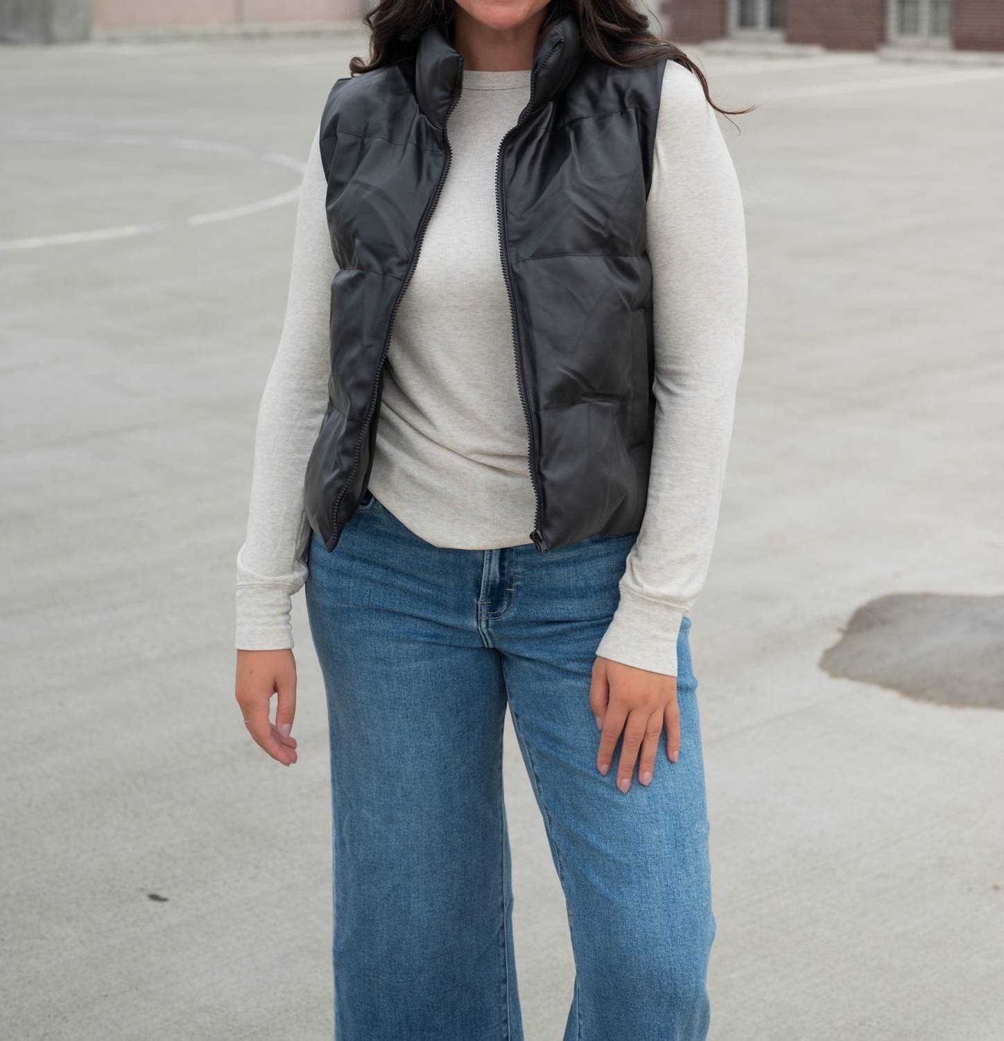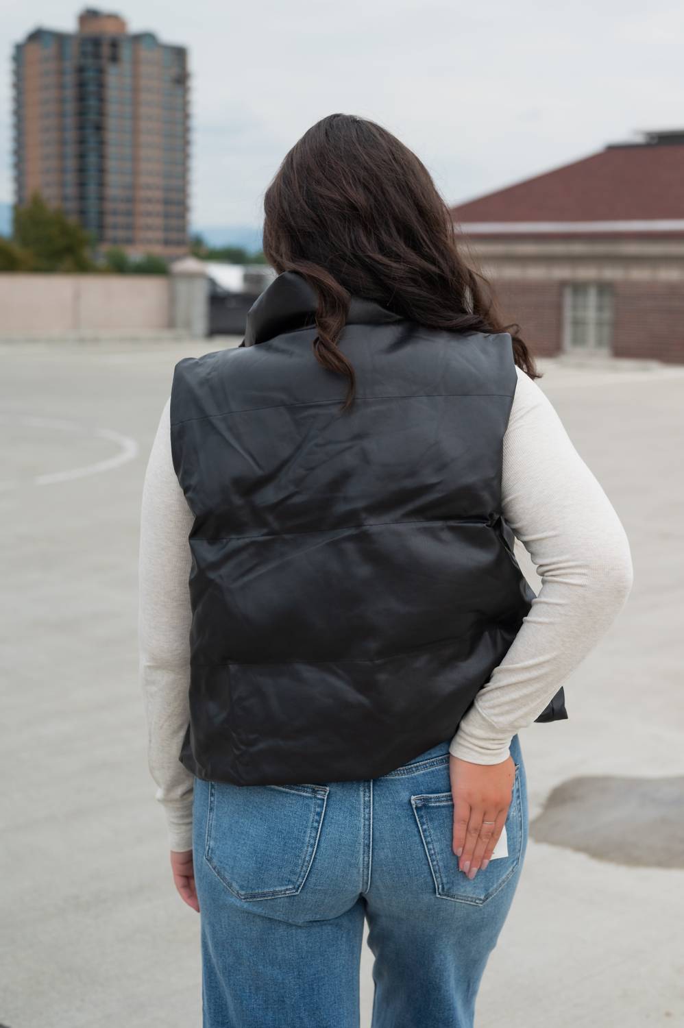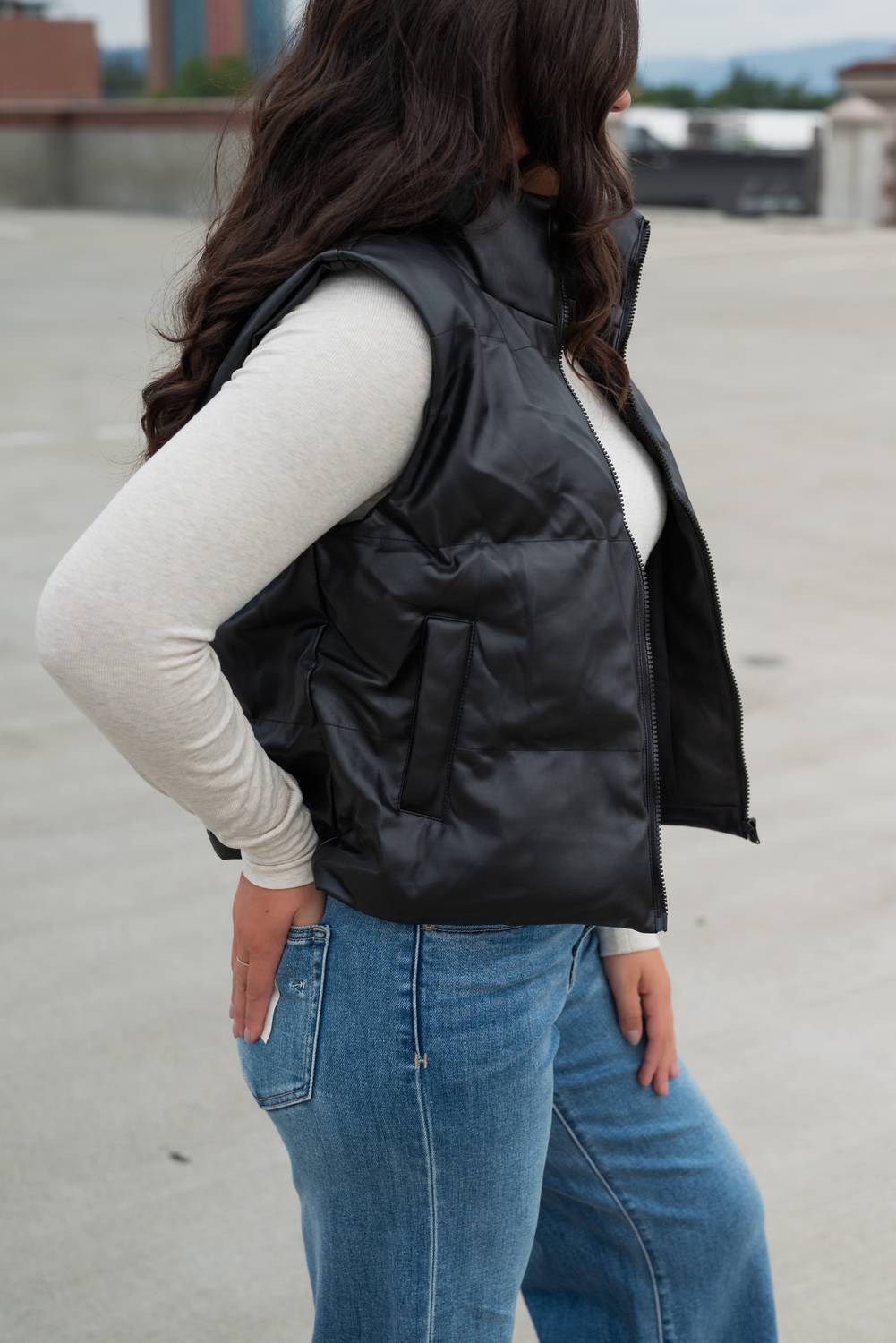 Throw this vest over an all black outfit for a perfectly polished look. Elevate your spring wardrobe with the Odessa Puffer Vest by ee:some, a minimalist essential in solid black. This sleeveless vest is crafted from a blend of 55% polyurethane and 45% polyester, boasting a trendy mockneck and a convenient zip closure. Perfect for layering on cool days, its boxy silhouette offers an edgy appeal while keeping you chic and comfortable. Care for it by hand washing and laying flat to dry, ensuring it remains a versatile staple for vacations or Thanksgiving gatherings.