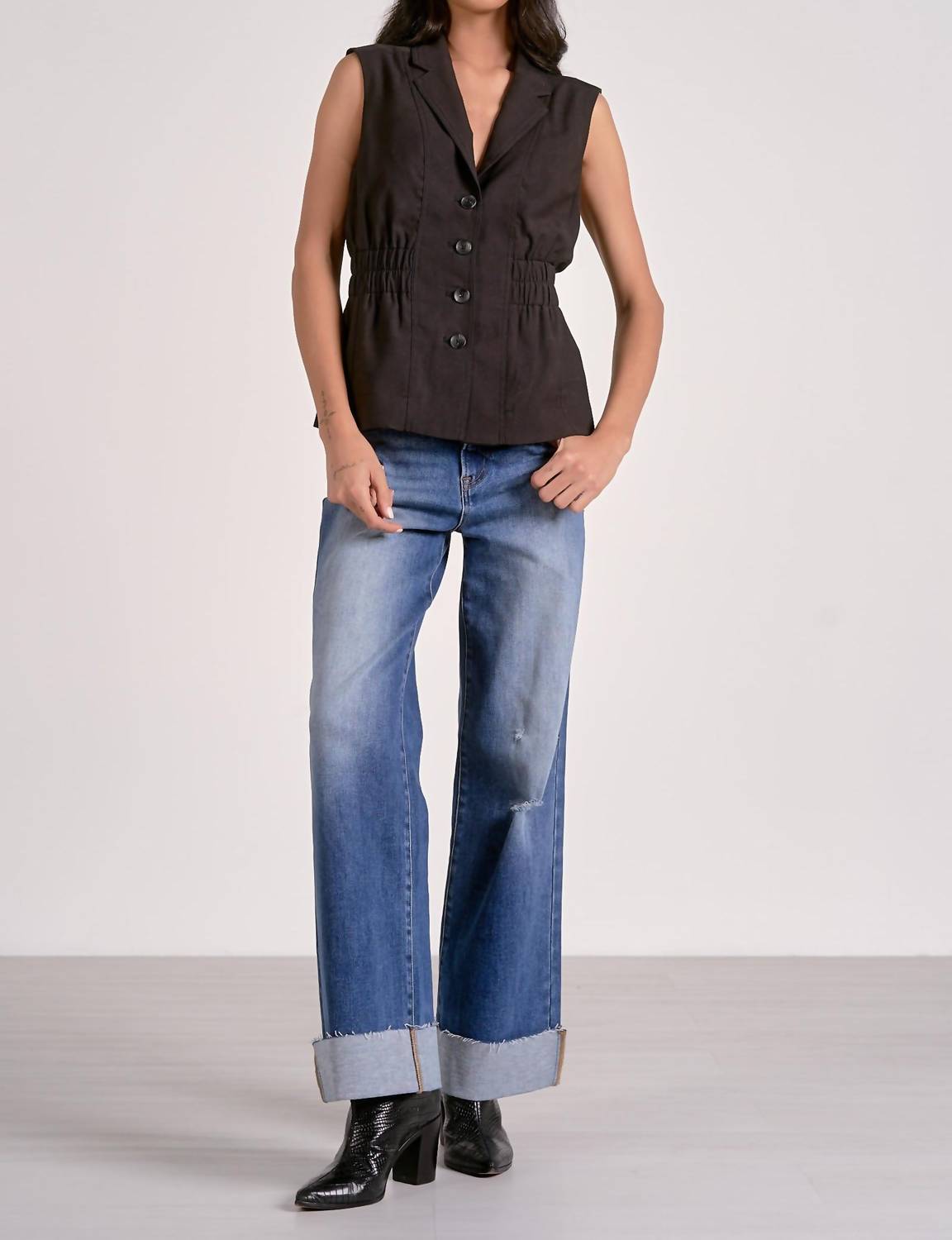 Introducing the ELAN Ava Side Ruched Vest Top, a stylish must-have for the minimalist fashionista. This sleeveless black vest features a button closure for easy wear and a flattering cinched waist that adds a touch of sophistication to any spring outfit. Perfect for hiking or elevating daily ensembles, it boasts a solid pattern and collar neckline. For care, simply machine wash to maintain its sleek, on-trend appeal.