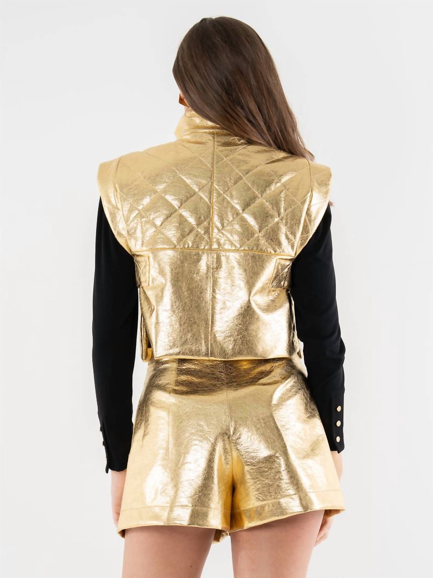 Throw this vest over an all black outfit for a perfectly polished look. Elevate your Spring wardrobe with the Annie Vest by Emily McCarthy, a glamorous addition in stunning gold vegan leather. This women's vest features cap sleeves and a chic turtleneck, offering a striking solid pattern perfect for evening events. It also boasts practical pockets and a convenient zip closure. Care for this standout piece is simple with dry clean instructions.