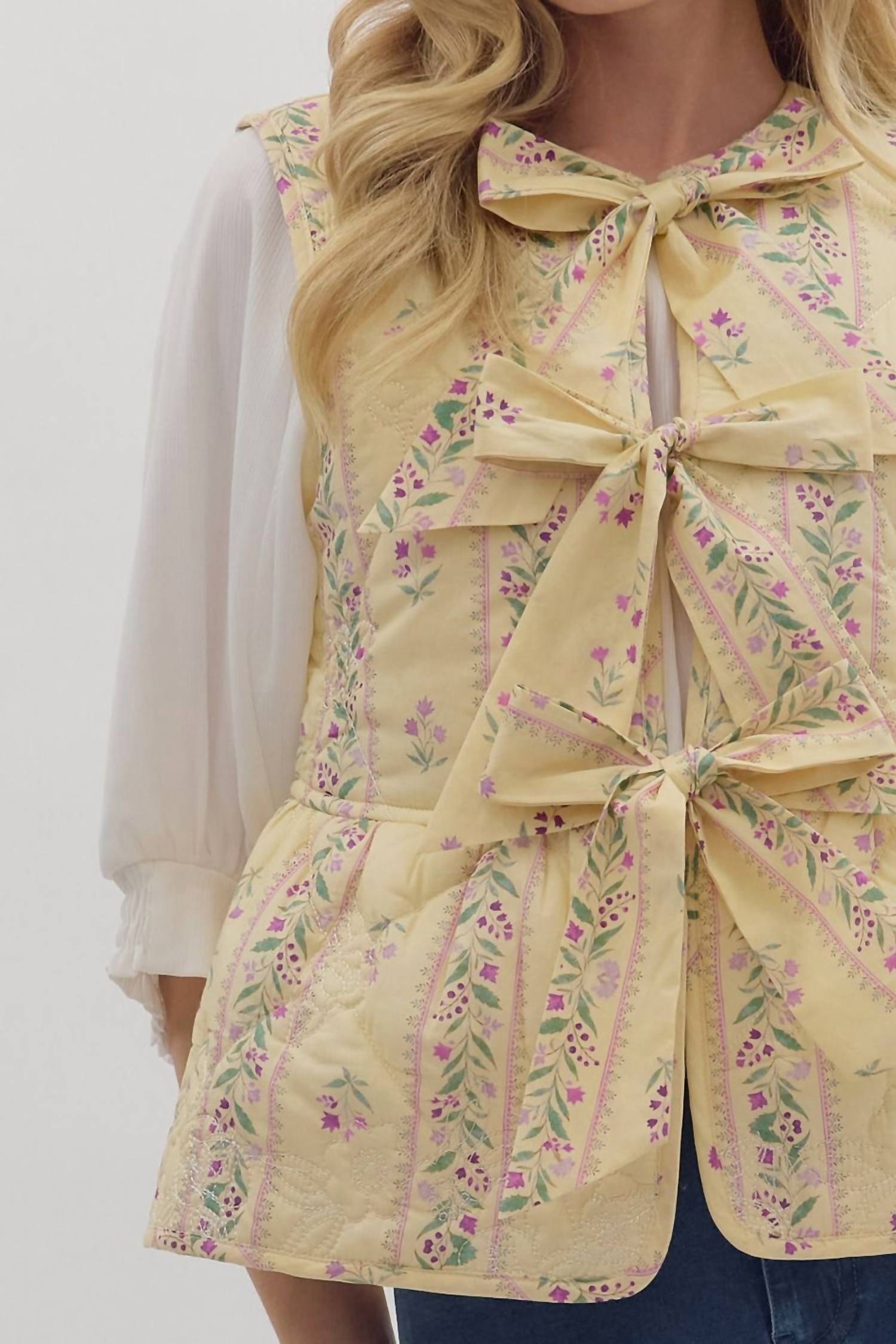 That extra layering piece you didn't know you needed! The Quilted Peplum Vest by Entro in ecru is a charming addition to your spring wardrobe, perfect for a boho chic look. This sleeveless vest features a delightful floral pattern with three bow tie closures in the front, adding playful detail. Crafted for a cozy quilted feel, it is fully lined and woven to ensure a peek-proof finish. Ideal for vacation or Thanksgiving festivities, this crewneck vest effortlessly enhances your style.