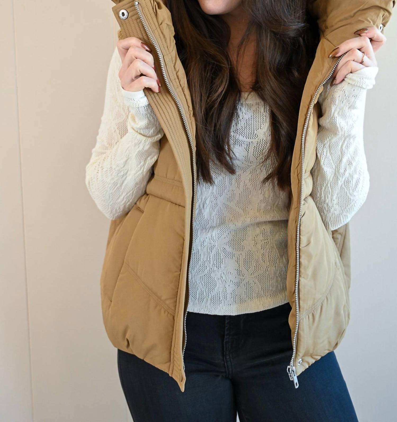 Throw this vest over an all black outfit for a perfectly polished look. Meet the Women's Moreland Avenue Puffer Vest by GREYLIN, a stylish addition to your wardrobe. This sleeveless vest is crafted from 100% polyester and features a modern ribbed texture in a warm brown hue. Designed with a cozy hood and zip closure, it's perfect for layering on chilly mornings or during travel. Available in sizes XS to L, with the model wearing size XS at a height of 5'0".