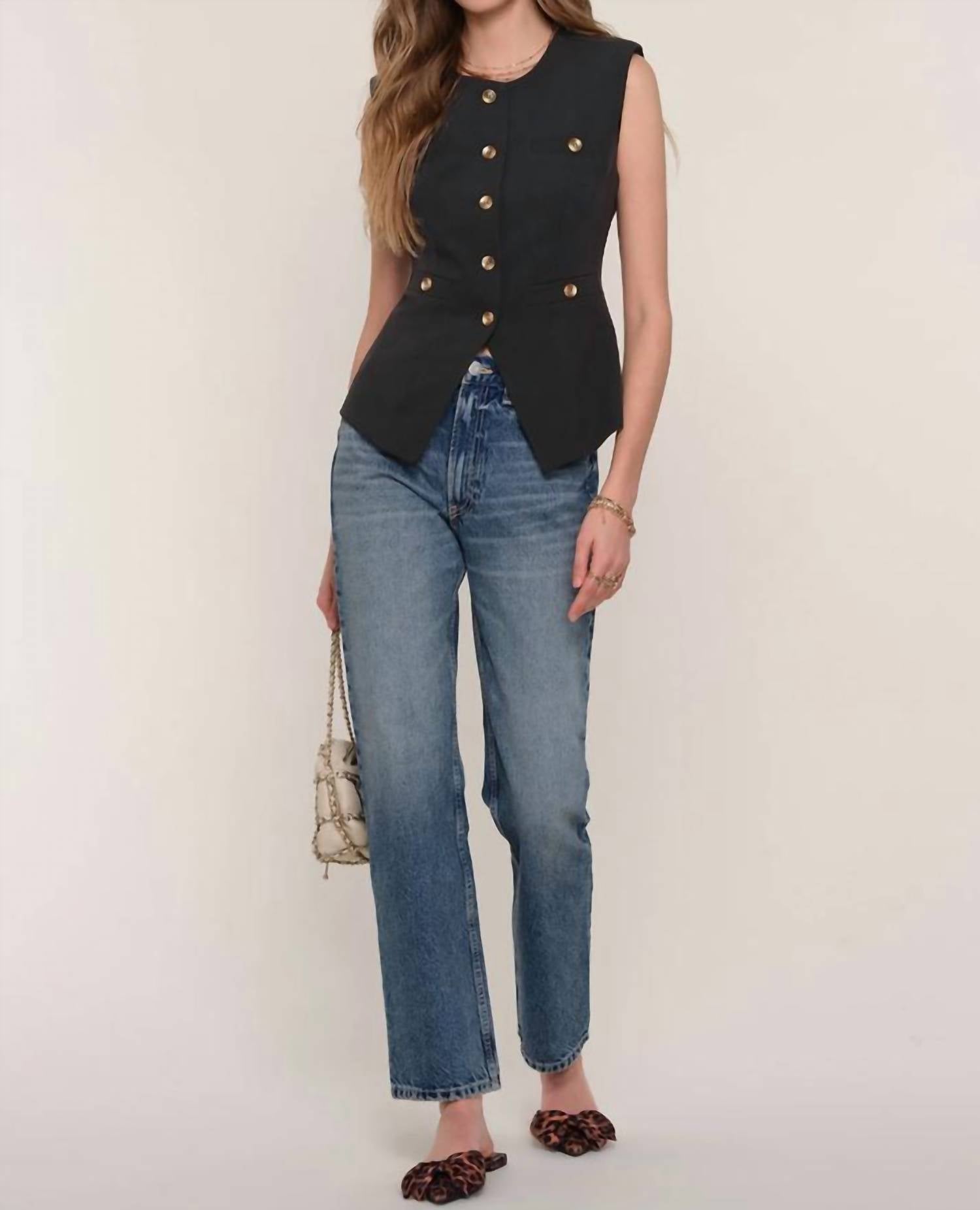 Throw this vest over an all black outfit for a perfectly polished look. The Roxanna Vest by Heartloom is a sleek minimalist piece, perfect for a vacation or versatile layering throughout the summer. Designed with a solid pattern in classic black, this sleeveless vest offers a comfortable fit and effortless style. Featuring a flattering crewneck and practical button closure, made of 92% Polyester, and 8% Spandex it includes pockets for added convenience. Care instructions: Machine wash and tumble dry.