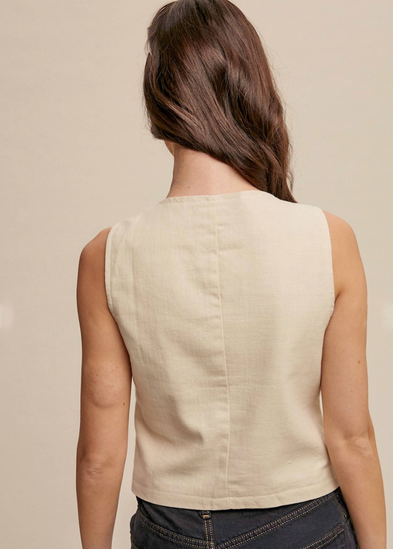 Throw this vest over an all black outfit for a perfectly polished look. Enhance your summer wardrobe with the Robin Classic Linen Vest by Listicle, an essential for chic layering. This sleeveless vest boasts a V-neckline and a convenient button closure, with front double welt pockets for added practicality. Crafted from soft linen, its beige solid hue makes it perfect for various holiday party ensembles. Enjoy the comfort of a lined interior, ideal for all-day wear.