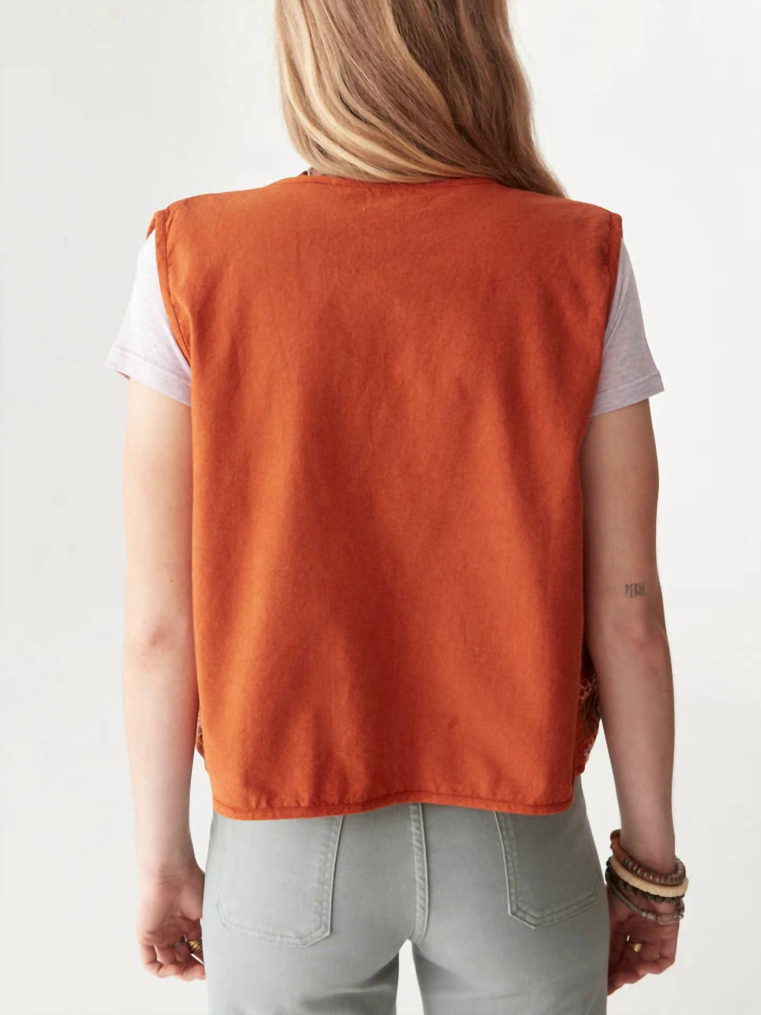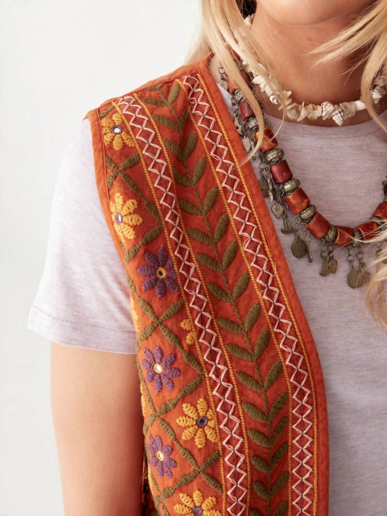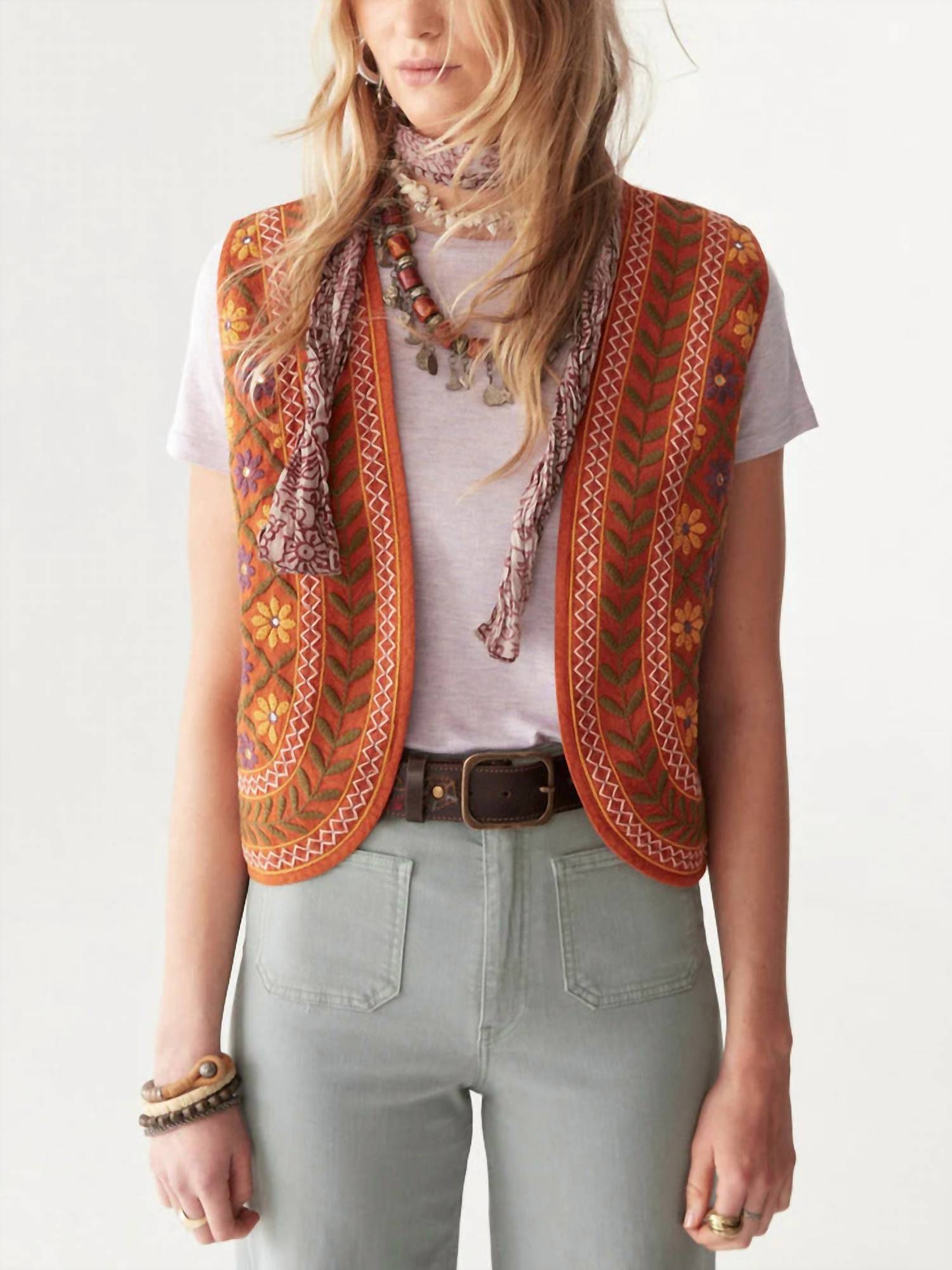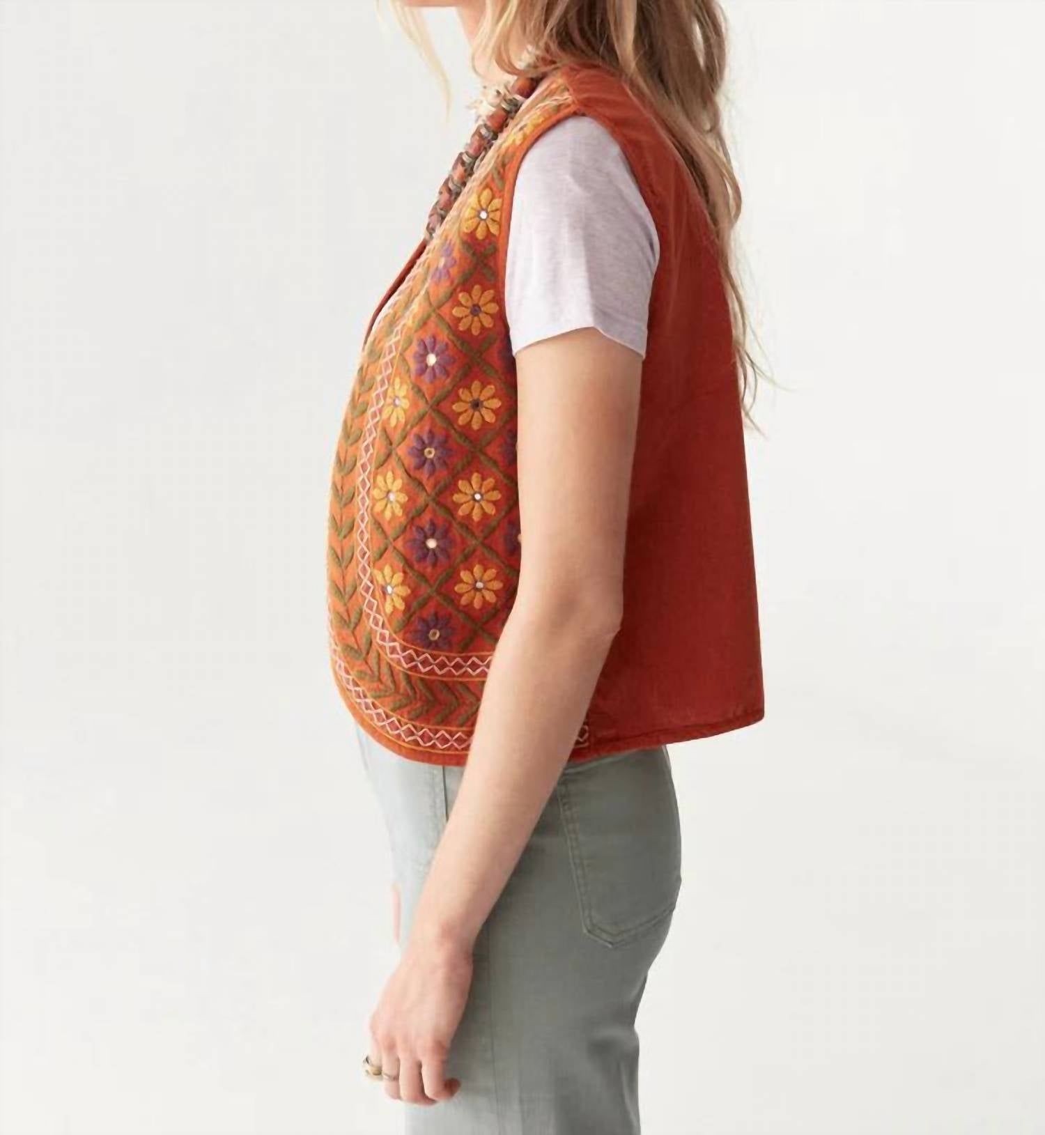 That extra layering piece you didn't know you needed! Elevate your spring wardrobe with the Maison Hotel Belongil Baez Vest in a captivating bleached terracotta hue. This sleeveless vest, crafted from 100% cotton, showcases exquisite hand-embroidered floral details and bold geometric trims, epitomizing bohemian charm. Designed with an open-front and unstructured silhouette, it offers a perfect blend of vintage allure and modern freedom. Ideal for engagements or Easter celebrations, this vest is machine washable for your convenience.