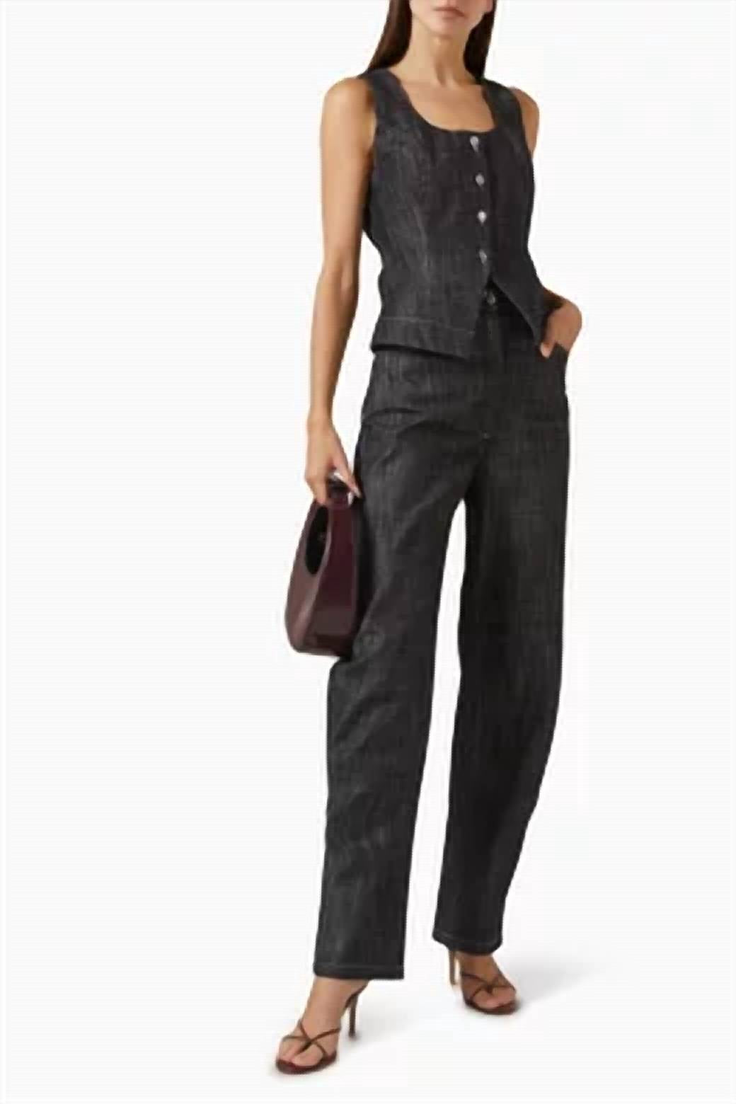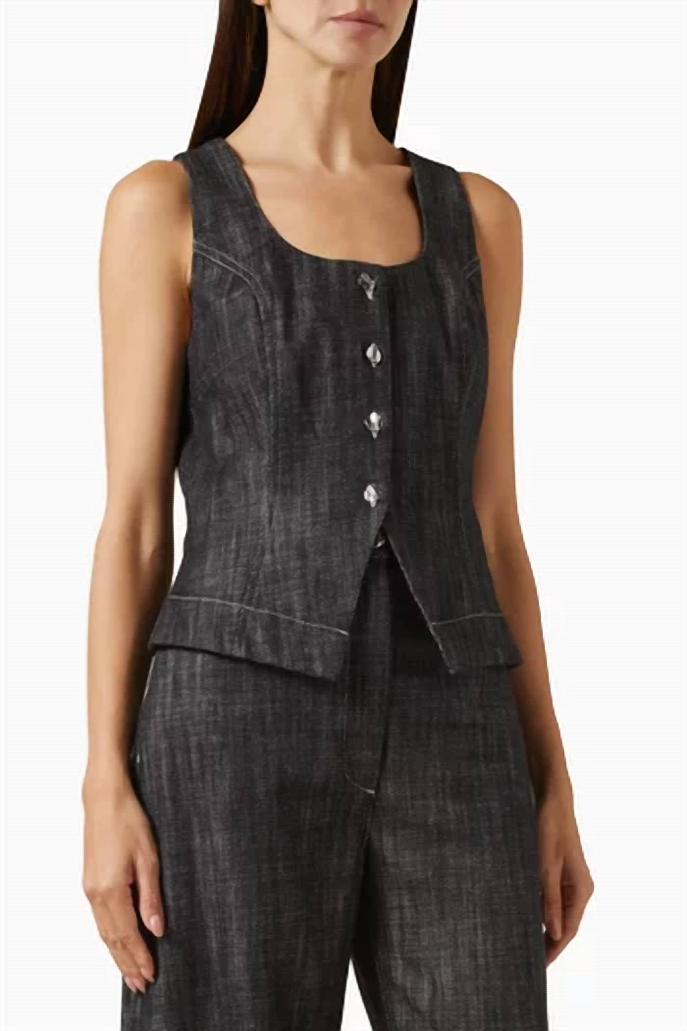 Throw this vest over an all black outfit for a perfectly polished look. Elevate your streetwear look with the Matthew Bruch Women's Scoop Denim Black Vest, designed for chic music festival ensembles. This sleeveless vest is crafted from textured cotton for a stylish edge and features a flattering scoop neckline. It comes in a versatile black denim, with no lining or pockets to maintain a sleek silhouette. Closure: Button closure. Care: Dry clean. Perfect for the spring season.