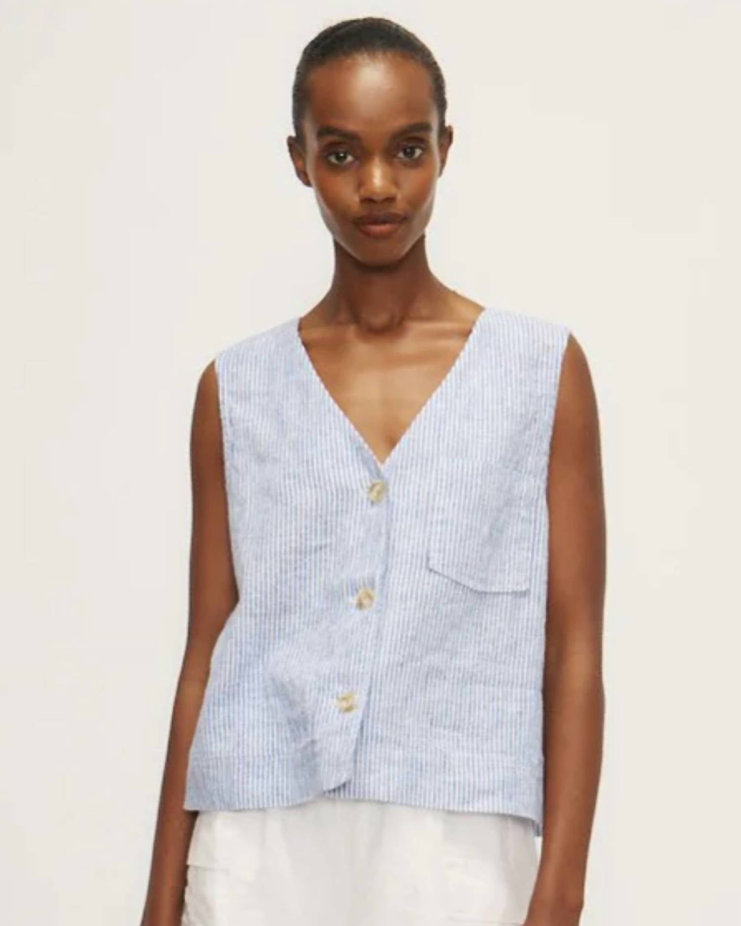 Throw this vest over an all black outfit for a perfectly polished look. The Melissa Nepton Linden Button Down Vest in Navy Stripe is your go-to for elegant, minimalist fashion. This sleeveless vest, composed of a 75% Linen and 25% Cotton blend, features a timeless stripe pattern and a practical front chest pocket. Its classic button closure and V-neck design make it a versatile addition to any summer wardrobe. Care instructions: Hand wash cold, do not bleach, dry flat, iron low.