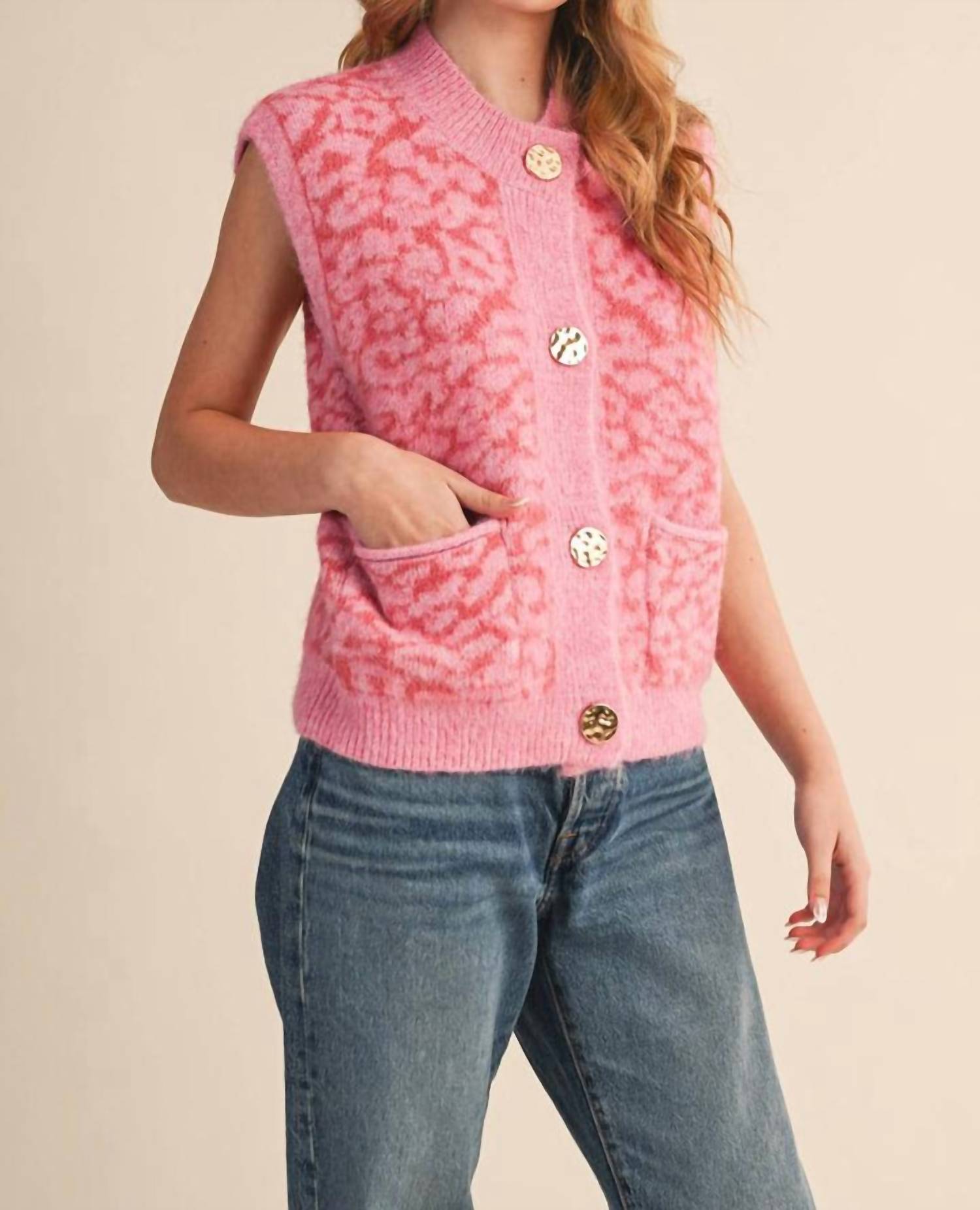 That extra layering piece you didn't know you needed! Introducing the Leopard Crewneck Vest by &merci, a chic addition to any wardrobe with its modern pink floral pattern. This sleeveless piece is crafted from a soft fuzzy knit that is cozy yet lightweight, featuring a classic gold button closure for effortless styling. The ribbed neckline, hem, and arm openings offer a polished finish, while its relaxed fit sits perfectly at the waist, perfect for layering during the fall season. Care: Hand wash and lay flat to dry.