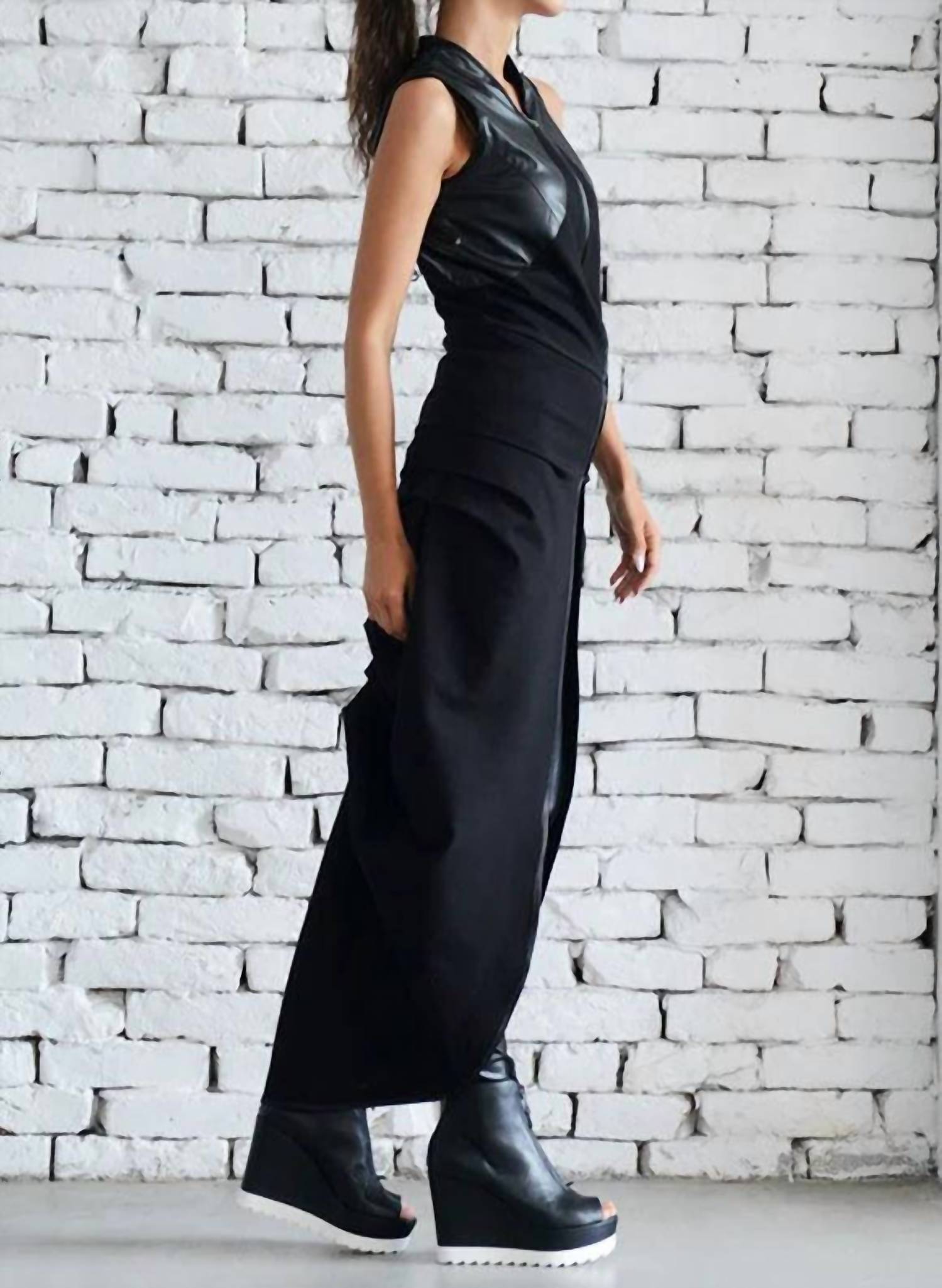 A vest so versatile you can mix and match it with almost any outfit and it will feel brand new every time. Meet the Asymmetric Vest by Metamorfosi, designed for contemporary elegance in classic black. This sleeveless vest is crafted from Punto Di Milano heavy knitted fabric, comprising 65% viscose, 30% polyamide, and 5% elastane, combined with 100% polyester eco leather, offering both comfort and unique style. With an impressive length of approximately 140 cm (55 inches) at its longest point, this solid-pattern vest features a V-neckline and zip closure for a flattering silhouette. Care: Wash at 30°C, iron at a maximum of 110°C (avoid ironing leather parts), do not bleach, do not tumble dry.