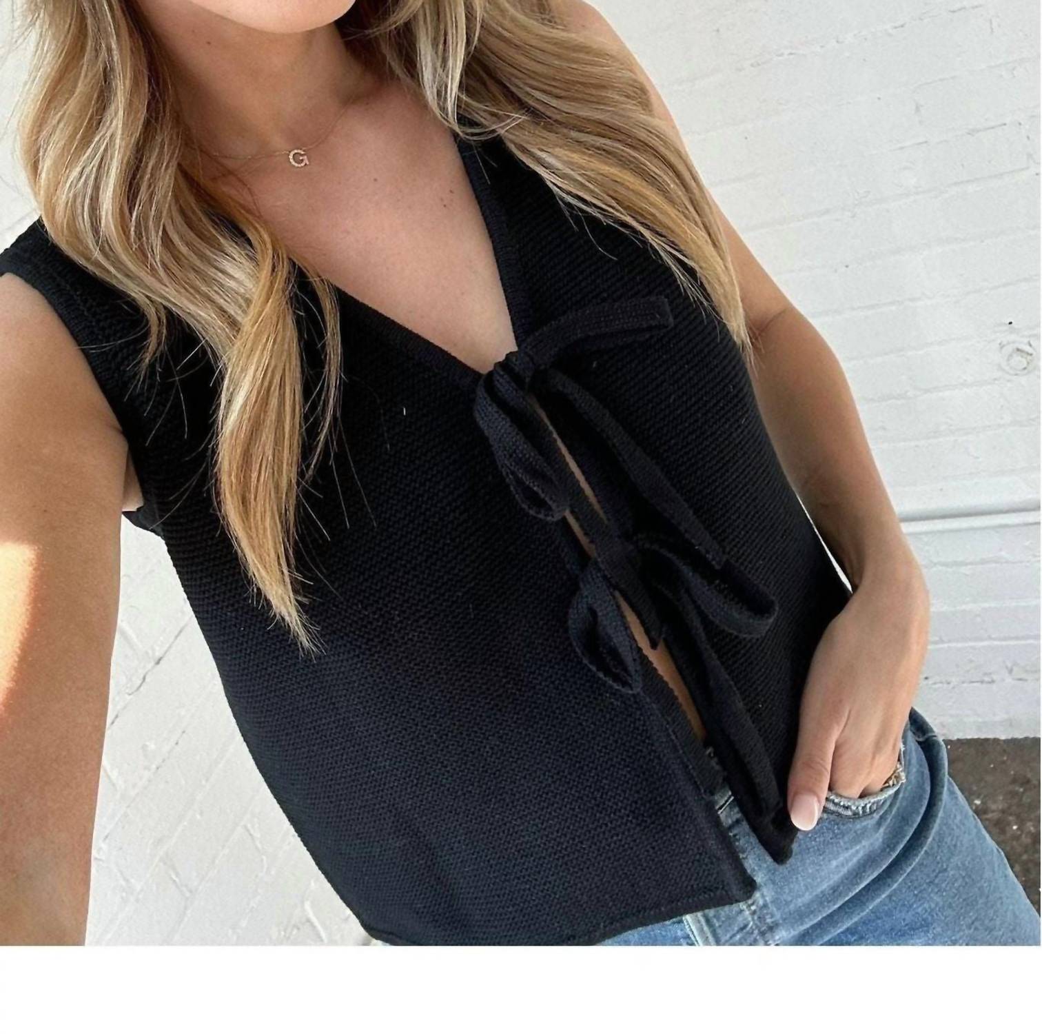 A vest so versatile you can mix and match it with almost any outfit and it will feel brand new every time. The Knotted & Noticed Knitted Tie Front Vest by MIOU MUSE is a must-have for your Fall wardrobe. Featuring a sleeveless design in versatile black, this vest is made from 100% cotton and boasts a chic tie closure at the front for a playful, adjustable fit. Its solid color and V-neckline make it a perfect layering piece, whether worn solo or over a tee. Care is easy with machine wash and lay flat to dry instructions, ensuring it remains effortlessly cozy for your travel needs.