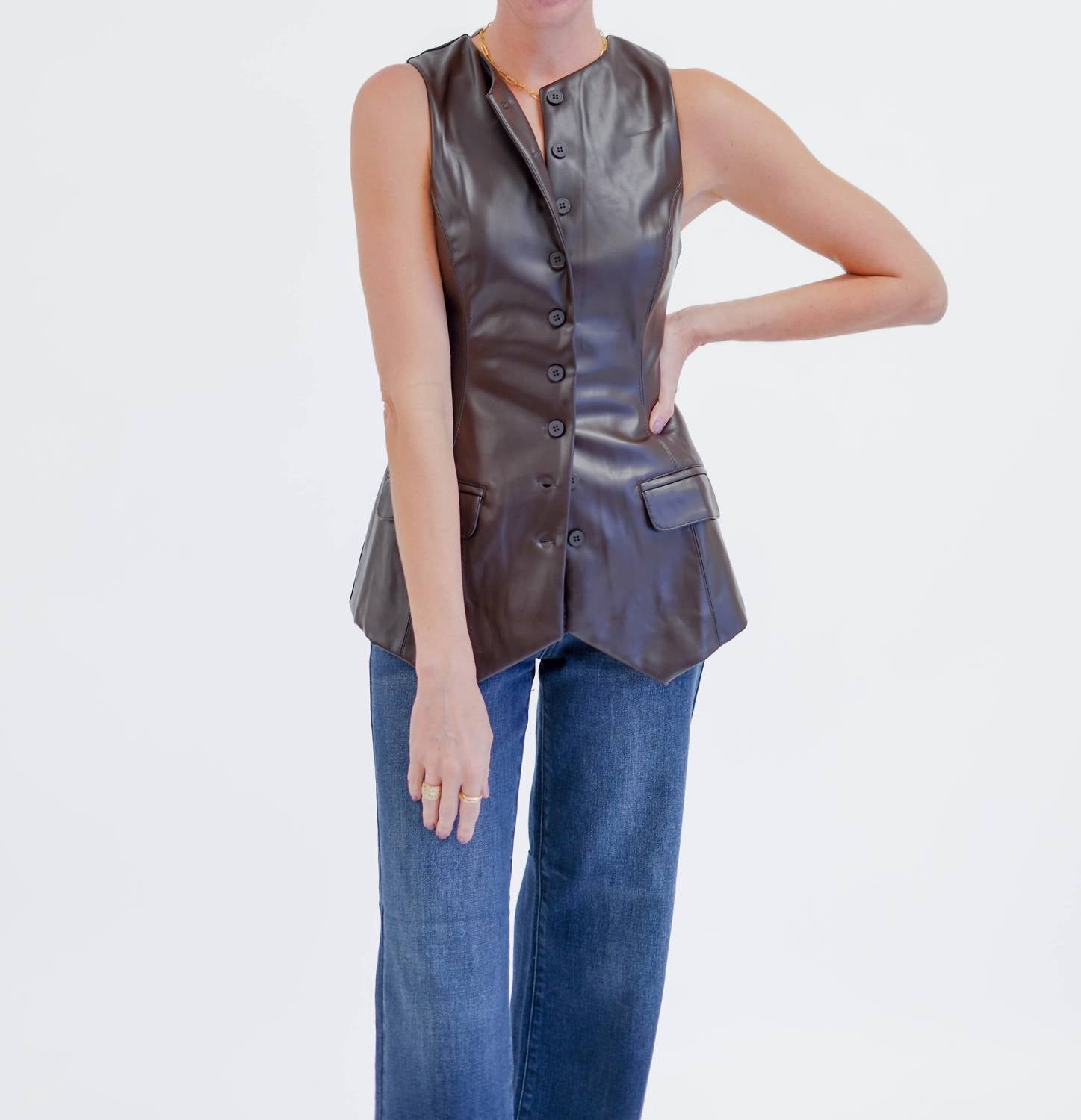 Throw this vest over an all black outfit for a perfectly polished look. Introducing the Sleeveless Faux Leather Button Front Vest by OLIVACEOUS, a chic addition to your fall wardrobe in dark chocolate. Designed for women, this solid monochrome piece features a scoop neckline and is crafted from luxurious faux leather. Closure: Button closure. This versatile vest effortlessly adds sophistication to any engagement outfit, perfect for the Easter season. Pockets: Yes.