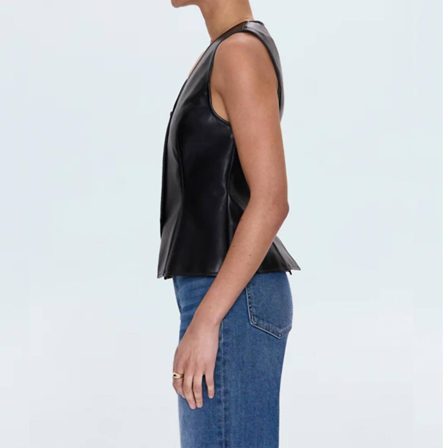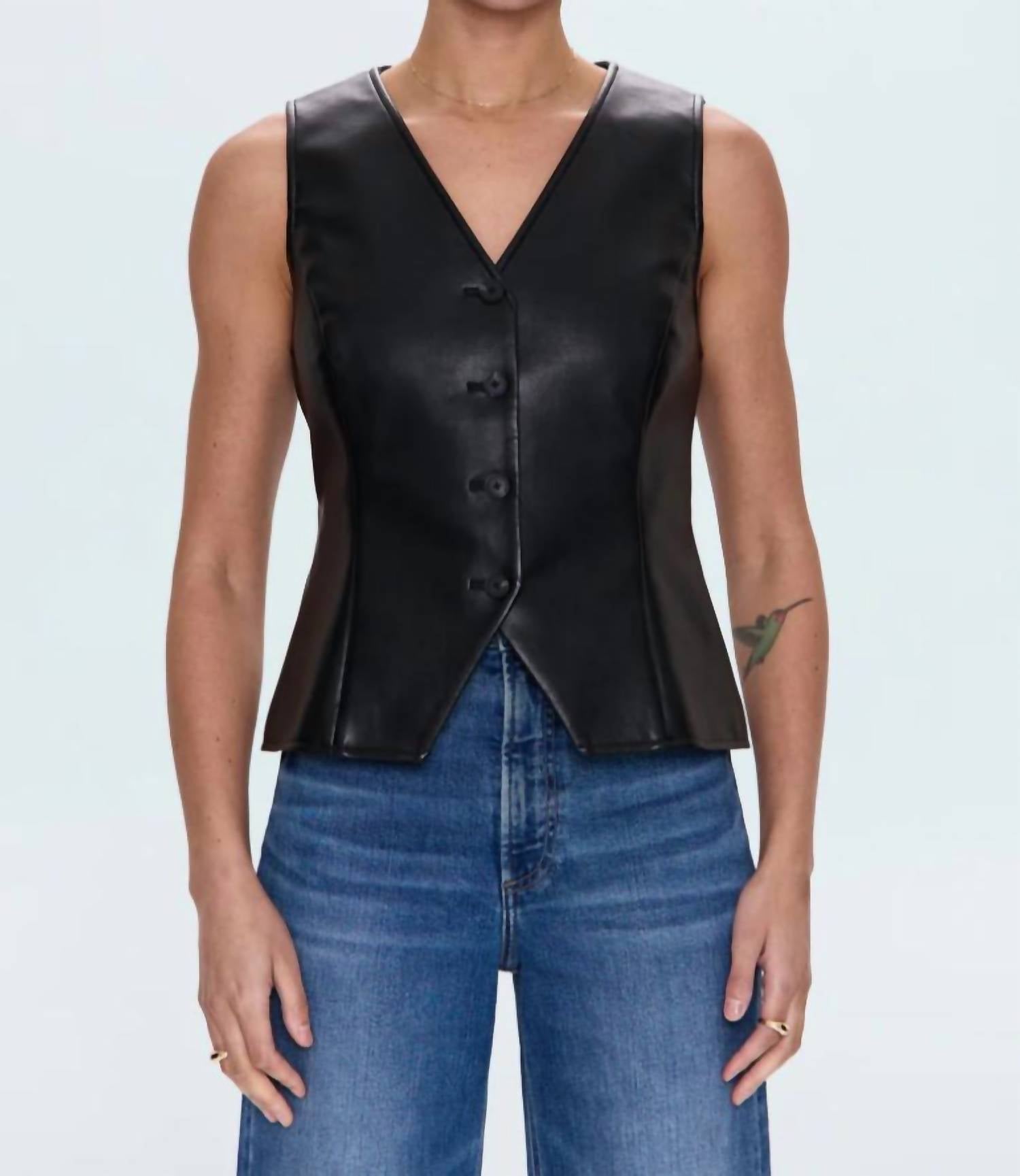Throw this vest over an all black outfit for a perfectly polished look. Introducing the Danica Button Down Vest by PISTOLA, a sleek addition to any wardrobe that exudes a minimalist allure. This sleeveless vest boasts a tailored design with a V-neck and button closure, crafted from a leather-like Polyurethane in Onyx. With a solid pattern and a polyester backing, it adds a touch of sophistication perfect for cocktail parties. Care: Machine wash.